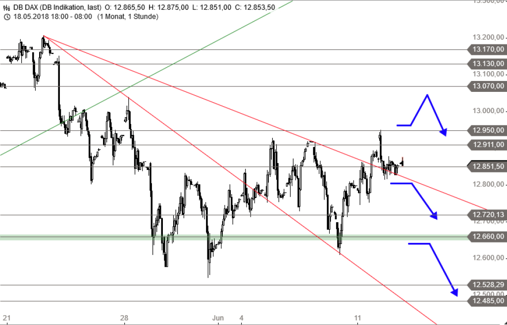 Rückblick: Am Freitag setzte der DAX auf die zuvor überschrittene Abwärtstrendlinie zurück und startete bei 12.600 Punkten eine Erholung, die ihn im gestrigen Handel an den anvisierten charttechnischen Widerstand bei 12.950 Punkten führte. Und dort schlugen die Bären wie erwartet zu: Direkt nach der bullischen Eröffnung setzte eine Verkaufswelle ein, die den Index an die 12.800 Punkte-Marke drückte. Seither tendiert der DAX seitwärts. Die Verkaufswelle hat das Potenzial, die Erholung der letzten Tage zu beenden.