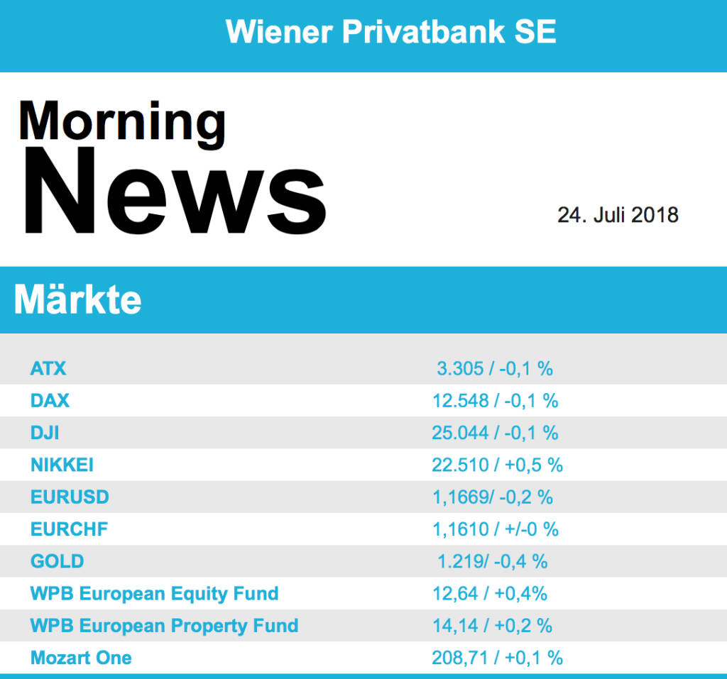 Vorbörslich sind die europ. Börsen positiv indiziert. Die asiatischen Börsen schließen mehrheitlich im Plus. Die Regierung in Peking kündigte an, die heimische Exportwirtschaft im Kampf gegen die US-Strafzölle zu stützen. Weitere Impulse könnten heute von neue Konjunkturdaten kommen. Die Einkaufsmanagerindizes der Eurozone für den Monat Juli werden veröffentlicht. In den USA werden heute noch 3M , AT&T, Texas Instruments und Verizon berichten.