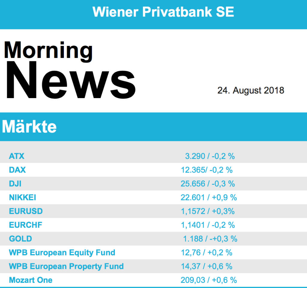 Nur wenig Veränderung gab es am gestrigen Handelstag an den europäischen Börsen, die wichtigsten Indices beendeten den Tag nahezu unverändert. Nach wie vor belastet der Handelsstreit zwischen China und den USA die Märkte, und die erhoffte Einigung bei den Gesprächen diese Woche konnte bis jetzt nicht gefunden werden. Den zweiten Tag in Folge waren die Autowerte der schlechteste Sektor mit einem Minus von rund 1,5%. Nach wie vor ist die Branche durch die Gewinnwarnung von Continental belastet, der deutsche Reifenhersteller gab auch gestern 4,3% ab, mehrere Analysten hatten ihr Kursziel gesenkt. Am besten hielt sich gestern der Sektor der Technologiewerte mit einem Zuwachs von 0,8%. Ryanair profitierte von der Einigung im Streit um die Arbeitsbedingungen für Piloten und legte knapp 5,5% zu. ABB in der Schweiz profitierte von wieder aufkeimenden Spekulationen über einen möglichen Verkauf des Stromnetzgeschäftes und konnte den Tag mit einem Plus von 1,7% beenden. Der Agrarchemiekonzern Bayer gibt sich trotz des negativen Urteils gegen Monsanto zuversichtlich, gestern musste der Titel trotzdem rund 1,8% abgeben. Beiersdorf konnte an den jüngsten Aufwärtstrend anknüpfen und zog um 1,4% an.