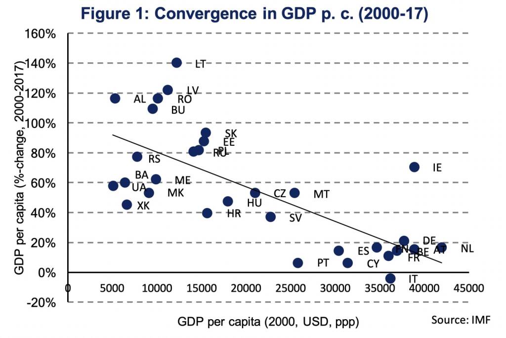 Central and Eastern Europe (CEE) makes substantial progress in closing the income gap relative to Western Europe. Figure 1 shows the level of per capita gross domestic product (GDP p. c.) in 2000 and the percentage change between 2000 and 2017. Countries with lower GDP p. c. exhibit higher growth rates. After the dissolution of the Socialist Federal Republic of Yugoslavia in the 1990s, some of the successor states – Croatia (HR), Bosnia & Herzegovina (BA), Kosovo (XK), Macedonia (MK), Montenegro (MT) and Serbia (RS) – had lower living standards than most European countries and made slower progress in converging towards Western European income levels (lower-left part of figure 1). Serbia had a per capita GDP of 7,800 USD in 2000 which increased by 77.7 %. Kosovo’s population was poorer (6,500 USD p. c. GDP) and made less catch-up progress (45 %).