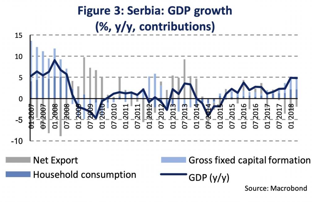 While the long-term catch-up potential remains high, Serbia and Kosovo had solid business cycles in recent years. In Serbia, economic growth has been accelerating during the first half of 2018 (Figure 3). Growth picked up to 4.9 % during H1, after GDP had risen by 1.9 % last year. The acceleration was induced by rising domestic demand. In Q2 2018, household consumption increased by 3.1 % and gross fixed investment rose strongly by 12.1 % (y/y). Exports and imports are growing (7.1 % and 9.2 % y/y) albeit the net contribution of exports to GDP growth has been negative.