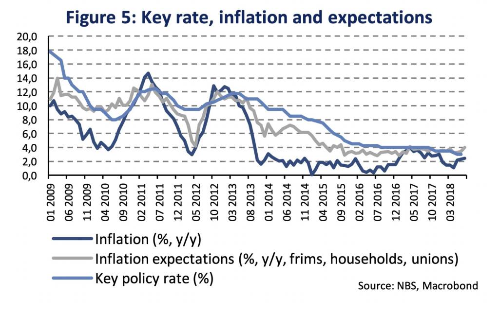 Price trends in Serbia are benign and interest rates are now relatively low. Main upside risks to prices stem from international developments. Consumer prices have been gradually accelerating in Q2 and Q3 (2.4 % y/y) amid rising food & beverage (contributing 1.2 % to overall inflation) and energy (0.34 %) prices as well as rising core inflation (0.9 %-age points contribution). The inflation rate has moved into the target band (3 % +/- 1.5 %-age points) of the National Bank of Serbia (NBS). According to the NBS projection, inflation will remain in the tolerance band until end-2019. The inflation rate will likely keep rising until end-2018 to average 2.7 % over the total of the year. Private inflation expectations appear well anchored around the inflation target.