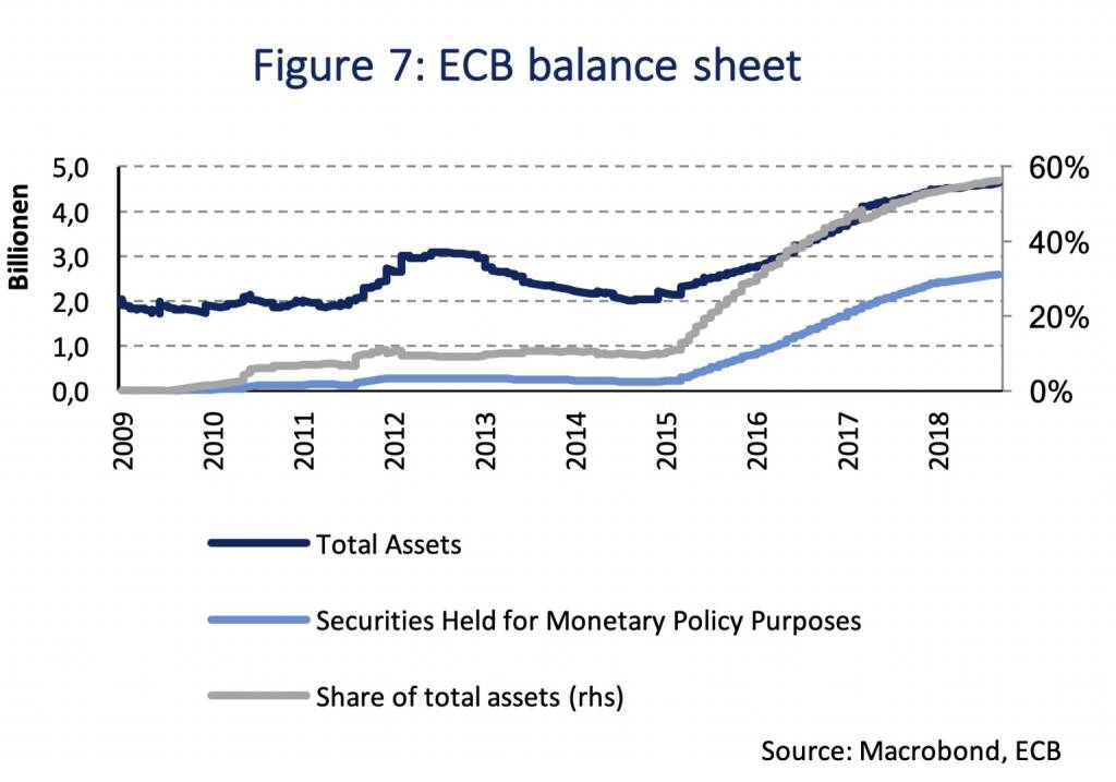 Last week’s meeting of the ECB’s Governing Council was well in line with expectations. As previously announced, the net purchases under the asset purchase program (APP, also known as QE) will be further reduced to 15 billion EUR in October with the objective to end net purchases by year-end. However, that’s not the end of QE. The stock of acquired assets will be further reinvested, thus, providing significant monetary policy stimulus to support the sustained convergence of inflation to levels that are below, but close to, 2 % over the medium term. Until August 2018 the ECB has accumulated a stock of 2,510 billion EUR of assets under the APP, which will grow to 2,585 billion EUR until the end of the year and is anticipated to stay constant thereafter. The total ECB balance sheet has more than doubled since the start of APP in Q4 2014 and the share of securities held for monetary policy purposes has increased to 56 % in early September 2018 (Figure 6). A timeline for a possible reduction of the ECB balance sheet has not yet been communicated and reinvestment is intended to last “for as long as necessary to maintain favorable liquidity conditions and an ample degree of monetary accommodation” (ECB statement, September 2018). In the United States, the Federal Reserve Bank has initiated a balance sheet reduction in October 2017, three years after the end of the bond-buying program.