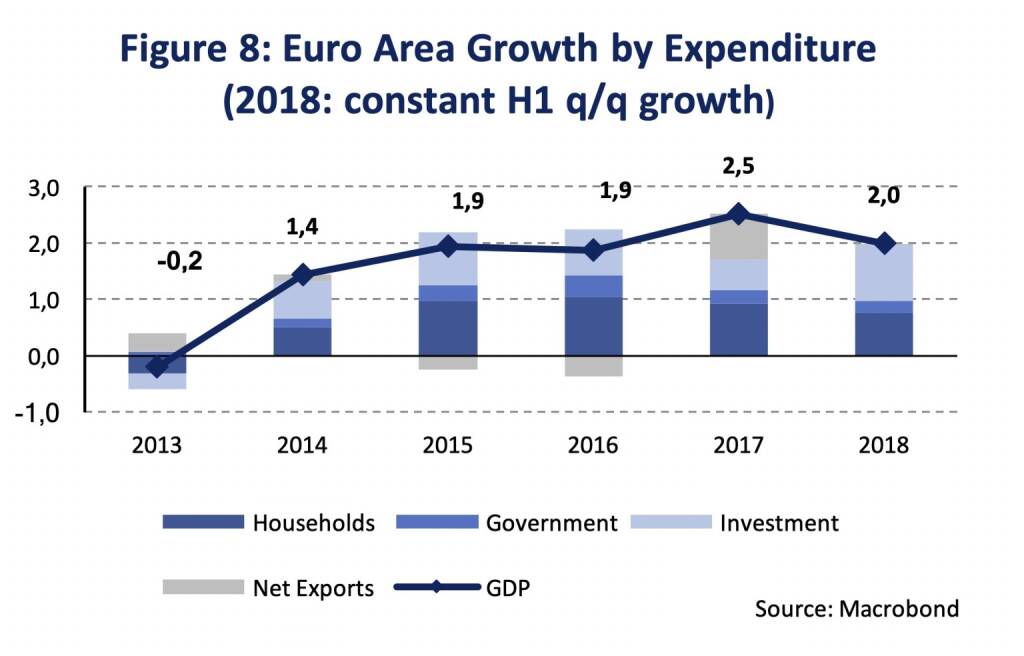 The economic expansion of the Euro Area has lost some pace during the first half of 2018 growing at 0,4 % per quarter after 0,7 % average quarter-on-quarter growth in 2017. Keeping the current pace at 0,4 % quarter-on-quarter growth for the third and fourth quarter of 2018 is consistent with the ECB’s GDP projection of 2.0 %. GDP growth of 1.8 % in 2019, however, suggests a growth rebound in 2019 to quarterly growth of just below 0.5 %. Keeping the current pace of 0.4 % quarter-on-quarter growth would result in growth at 1.6 % in 2019. In spite of the slowdown of growth, the Euro Area expands at or slightly above its potential growth rate of 1.4 % (OECD) or 1.5 % (European Commission, AMECO). The reason for slower growth in 2017 is weaker than expected export performance while domestic demand remains strong. Figure 8 shows GDP growth being decomposed by expenditure including a projection for 2018 which assumes expenditure components to grow at the same quarterly pace in H2 as in H1 2018. While net exports contributed significantly to GDP growth in 2017 it is non-existent in 2018. Seasonally adjusted quarter-on-quarter export growth of goods and services was 0.6 % in Q2 and even negative at -0.7 % in Q1. The long-term average is at 1 % (since 2002). Investment growth, however, is projected to accelerate in 2018 compared to the previous year, compensating partly for slower export growth.