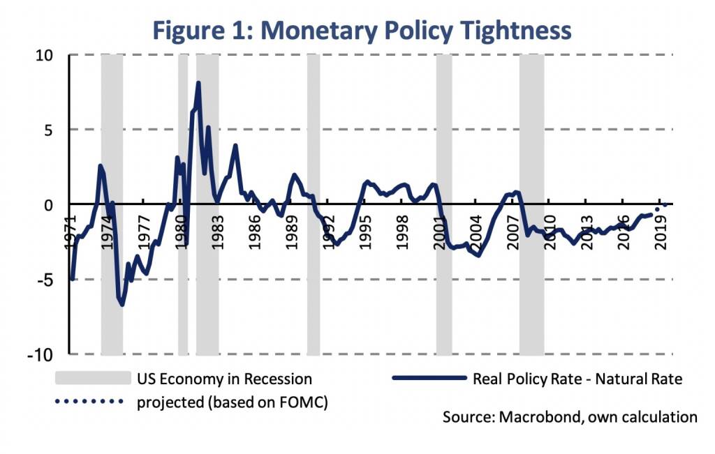 The FOMC statement remained mostly unchanged compared to the June statement. It says that the labor market has continued to strengthen and that economic activity has been rising at a strong rate. Job gains have been strong and the unemployment rate has stayed low (3.9 % in August). The personal consumption expenditure inflation (2.2 % in August) and the core inflation rate (2 %) remained near the inflation target. A sentence stating that “the stance of monetary policy remains accommodative” was removed from the statement. The real natural rate of interest, which is an important measure of the real interest rate, at which monetary policy is neither restrictive nor accommodative, has increased to 0.6 % in the latest update in Q2. The real federal funds rate (subtracting inflation from the federal funds) can be compared to the real natural interest rate to judge whether monetary policy is accommodative, tight or roughly neutral (Figure 1). [1] The path of the measure for monetary policy tightness (real fed funds rate minus real natural rate), which is approaching zero from below, indicates that monetary is about to become neutral.