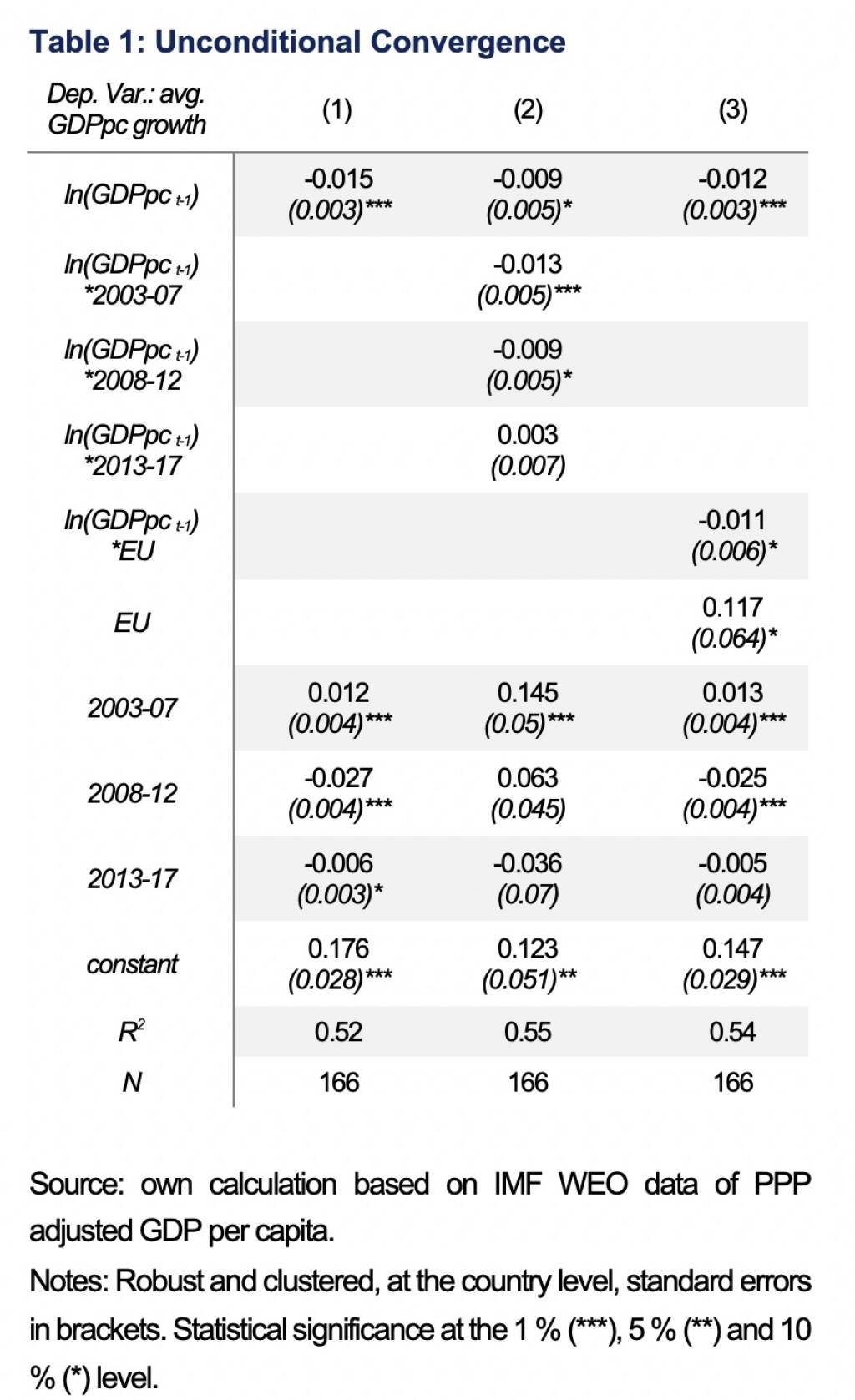 [10]Applying a two-stage-least-square approach with base year values as instruments, except for the initial GDP per capita variable in which case the lag is used, shows consistent results with a convergence coefficient of 2.0 %.