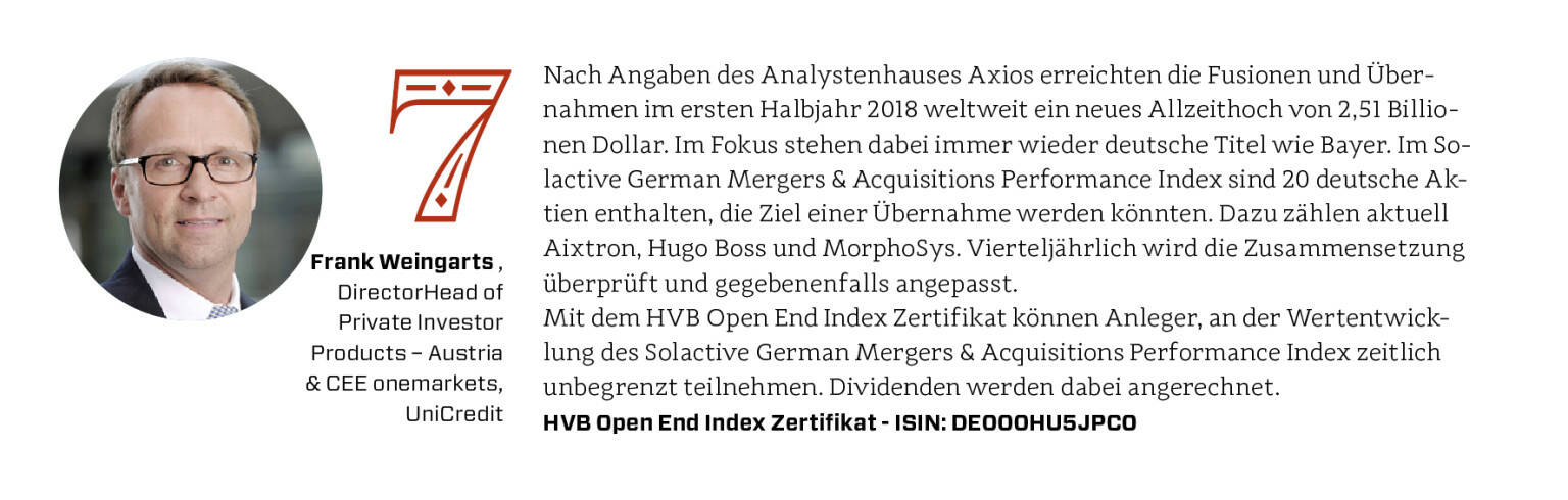 863 ZeichenNach Angaben des Analystenhauses Axios erreichten die Fusionen und Übernahmen im ersten Halbjahr 2018 weltweit ein neues Allzeithoch von 2,51 Billionen Dollar. Im Fokus stehen dabei immer wieder deutsche Titel wie Bayer. Im Solactive German Mergers & Acquisitions Performance Index sind 20 deutsche Aktien enthalten, die Ziel einer Übernahme werden könnten. Dazu zählen aktuell Aixtron, Hugo Boss und MorphoSys. Vierteljährlich wird die Zusammensetzung überprüft und gegebenenfalls angepasst.