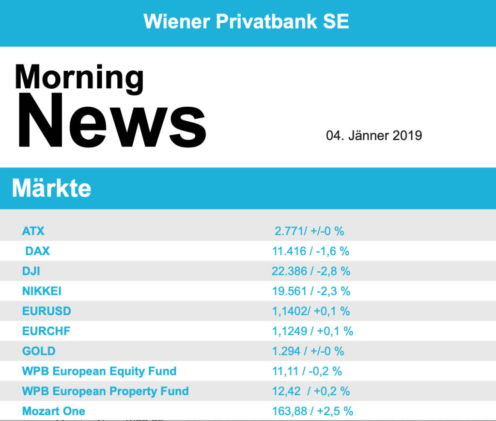 Die Apple -Umsatzwarnung und ein enttäuschender US-Einkaufsmanagerindex für das verarbeitende Gewerbe befeuerten die zuletzt bereits auf die Stimmung drückenden Konjunktursorgen noch. Die Apple -Zulieferer AMS , Dialog Semiconductor und STMicro verloren 23,2 bzw. 9,7 bzw. 11,7 Prozent. Im weiteren Technologiebereich sackten Aixtron um 10,3 Prozent ab, Infineon um 4,7 Prozent und SAP um über 3 Prozent. Der Stoxx-Branchenindex Technologie lag mit einem Minus von 4,2 Prozent weit abgeschlagen am Ende. Für Rohstoffwerte ging es um 2,6 Prozent nach unten - sie gelten als besonders konjunkturempfindlich und abhängig von der Nachfrage aus China. Vermeintlich sichere Bundesanleihen blieben gesucht; die Zehnjahresrendite lag mit 0,16 Prozent auf dem tiefsten Stand seit April 2017. Gewinner der Verunsicherung waren am Aktienmarkt die als defensiv geltenden Sektoren Telekommunikation (+0,8 Prozent), Versorgung (+0,1 Prozent) und Lebensmittelherstellung (+0,2 Prozent). Unter den Einzelwerten gewannen Next 4,1 Prozent, nachdem der Textil-Einzelhändler mit seinem Ausblick positiv überrascht hatte. Konjunktursorgen und negative Analystenkommentare drückten die Kurse der Zeitarbeitsunternehmen Adecco und Randstad um 5,2 und 6,8 Prozent. Fluglinienaktien litten darunter, dass Delta Air von fallenden Ticketpreisen im Dezember berichtete. Lufthansa verloren 2,6 und Air France-KLM 2 Prozent. Der ATX schloss unverändert, gekauft wurden Erste Group (+2,9%), VIG (+2,8%) und RBI (+1,8%).