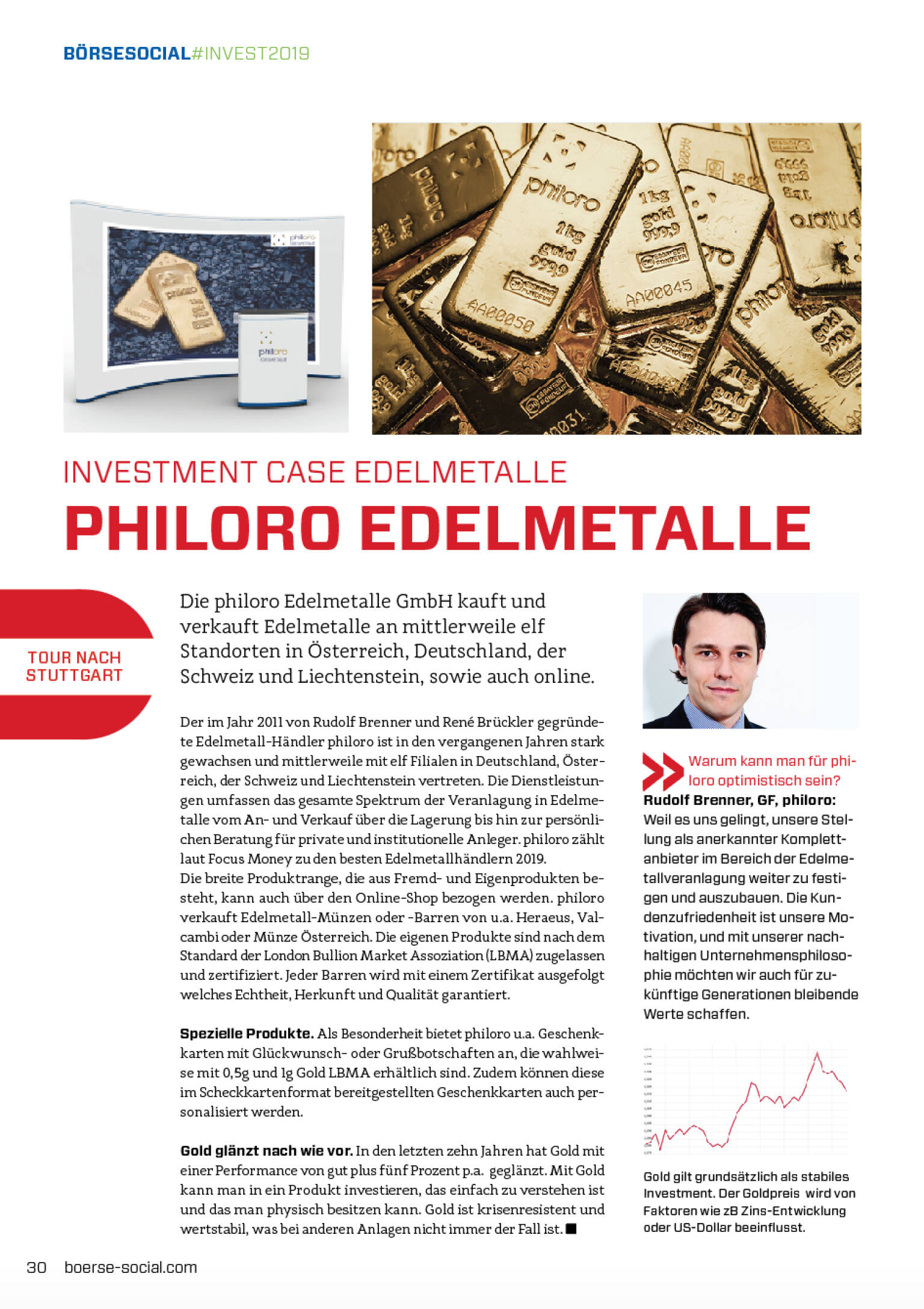 Der im Jahr 2011 von Rudolf Brenner und René Brückler gegründete Edelmetall-Händler philoro ist in den vergangenen Jahren stark gewachsen und mittlerweile mit elf Filialen in Deutschland, Österreich, der Schweiz und Liechtenstein vertreten. Die Dienstleistungen umfassen das gesamte Spektrum der Veranlagung in Edelmetalle vom An- und Verkauf über die Lagerung bis hin zur persönlichen Beratung für private und institutionelle Anleger. philoro zählt laut Focus Money zu den besten Edelmetallhändlern 2019.