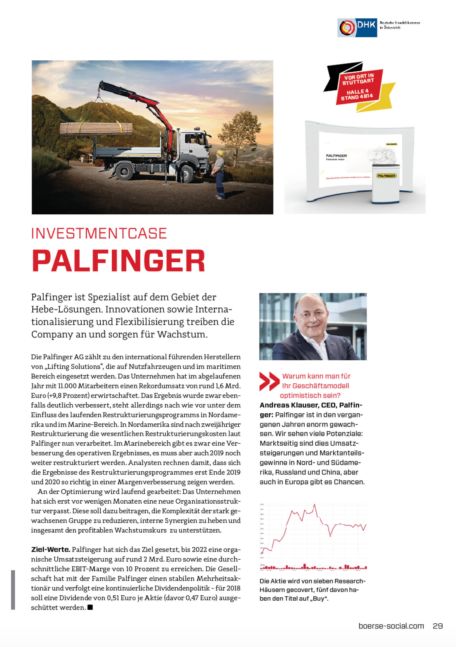 Ziel-Werte. Palfinger hat sich das Ziel gesetzt, bis 2022 eine organische Umsatzsteigerung auf rund 2 Mrd. Euro sowie eine durchschnittliche EBIT-Marge von 10 Prozent zu erreichen. Die Gesellschaft hat mit der Familie Palfinger einen stabilen Mehrheitsaktionär und verfolgt eine kontinuierliche Dividendenpolitik - für 2018 soll eine Dividende von 0,51 Euro je Aktie (davor 0,47 Euro) ausgeschüttet werden.