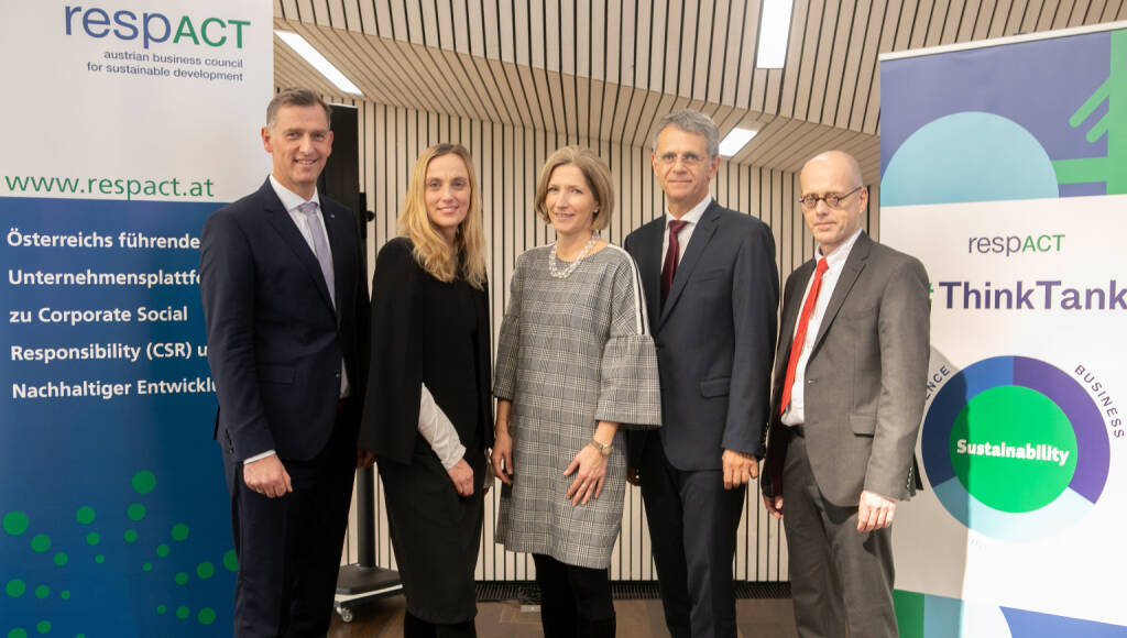 respACT - austrian business council for sustainable development: respACT & Österreichische Post AG: Zukunftsfähige Innovation muss verantwortungsvoll sein; v.l.n.r.: Simon Meinschad (respACT & hollu Systemhygiene GmbH), Daniela Knieling (respACT), Verena Knott-Birklbauer (Österreichische Post AG), André Martinuzzi (WU Wien) & Bernd Stahl (De Montfort University, UK), Credit: ANDREAS KOWACSIK