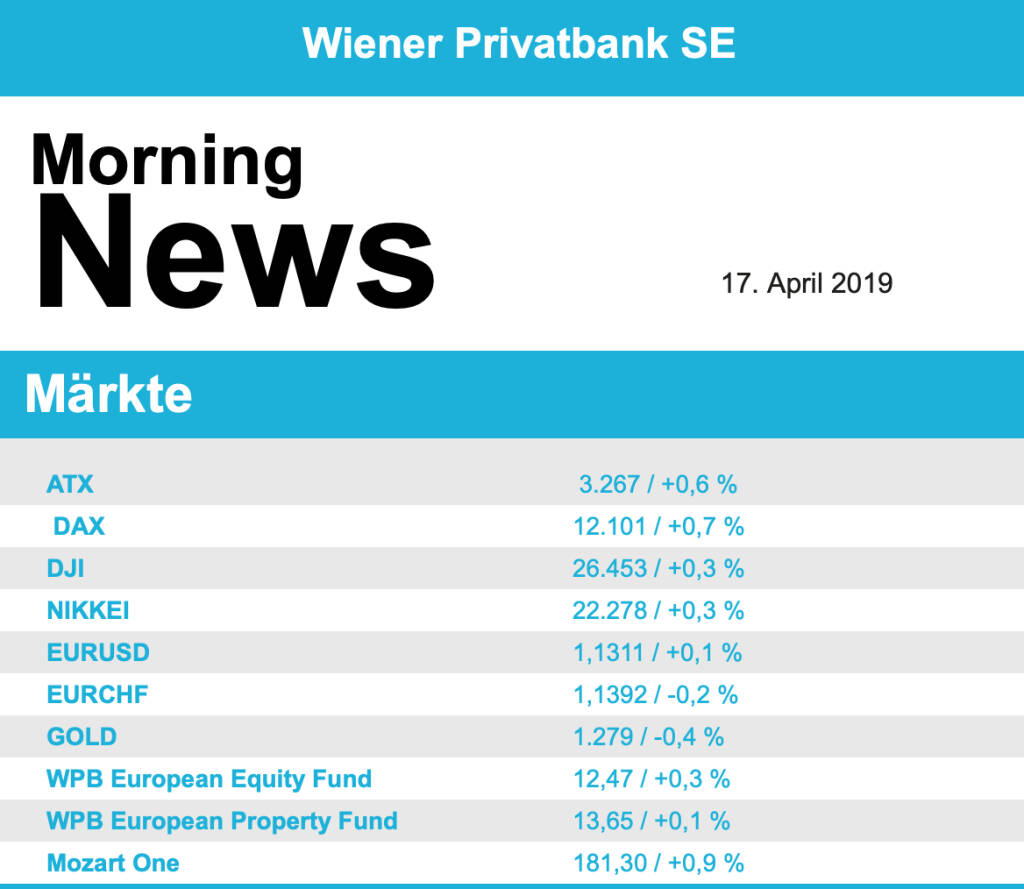 Im Blickfeld standen aber auch die Aktien von Unicredit, die italienische Großbank hatte wegen Verstößen der US-Sanktionen gegen den Iran eine Zahlung von 1,3 Milliarden US-Dollar akzeptiert, der Konzern hatte aber mit einer noch höheren Strafe gerechnet und konnte dadurch Rückstellungen von 300 Millionen auflösen, das brachte den Titel um 3,5% nach oben. Publicis, der französische Werberiese, profitierte immer noch von der am Vortag angekündigten Übernahme der Digitalmarketing-Tochter von Alliance Data Systems und konnte auch gestern 3,4% zulegen. In Italien legte der Zahlungsabwickler Nexi ein enttäuschendes Börsendebüt hin, nachdem das Unternehmen 2 Milliarden Euro bei der Ausgabe der Aktien eingenommen hatte musste der erste Handelstag mit einem Abschlag von 6,3% beendet werden. Rio Tinto verlor nach aktuellen Produktionszahlen für das erste Quartal 0,6%. Lufthansa hatte am Vorabend zwar einen Verlust gemeldet, bedingt durch hohe Treibstoffkosten und Überkapazitäten, dass die Fluglinie aber die Jahresziele bekräftigte wurde von den Anlegern mit einem Plus von 0,9% honoriert. Zalando erhöhte die Prognosen für das erste Quartal deutlich, anstatt eines vom Markt erwarteten Verlustes rechnet das Unternehmen mit einem Gewinn, der Aktienkurs schnellte 6,6% nach oben. Commerzbank konnte sich um 3,1% befestigen, laut Medienberichten hat auch der niederländische Finanzkonzern ING Group Interesse an der Bank. Der deutsche Großküchenhersteller Rational profitierte von einer Kaufempfehlung durch die Berenberg Bank und konnte 3,2% zulegen.
