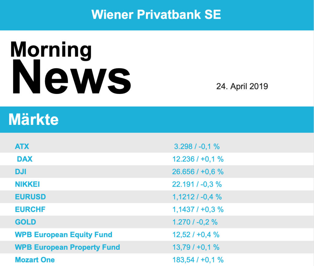 In Europa sind die Märkte vorbörslich etwas schwächer indiziert. Auch in Asien schliessen die Börsen mit leichten Verlusten. Von der Unternehmensseite gibt es in Österreich heute keine Meldungen. Von der Makroseite gibt es heute um 10 Uhr das IFO-Geschäftsklima in Deutschland.