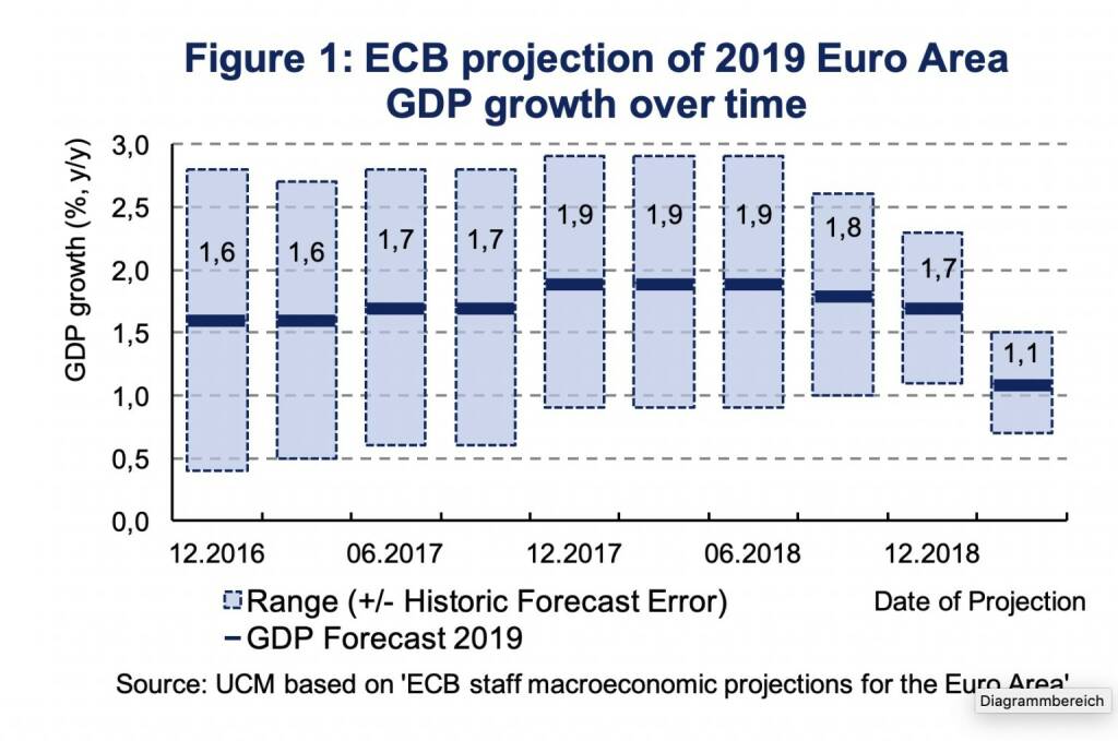 Central and Eastern Europe (CEE) maintains a solid expansion albeit a weakening external macroeconomic environment. The expansion of the global economy has slowed to 3.6 % in 2018 after 3.8 % in 2017 and the growth outlook for 2019 has further been lowered to 3.3 % (OECD, IMF). Business sentiment has deteriorated continuously throughout the year which can further be linked to elevated levels of political uncertainty. Trade tensions between the United States and China heightened and the future EU-UK relationship remains unclear. Among developed economies, the growth slow-down was markedly felt in the Euro Area. The European Central Bank (ECB) has revised its 2019 GDP growth projection downward since mid-2018 (Figure 1). The latest ECB staff macroeconomic projections from March indicate Euro Area GDP growth at 1.1 % in 2019. The preliminary estimate of first quarter GDP growth at 0.4 % (quarter-on-quarter, seasonally adjusted), which has been released at the end of April, shows a mild gain in economic momentum compared to the second half of 2018.