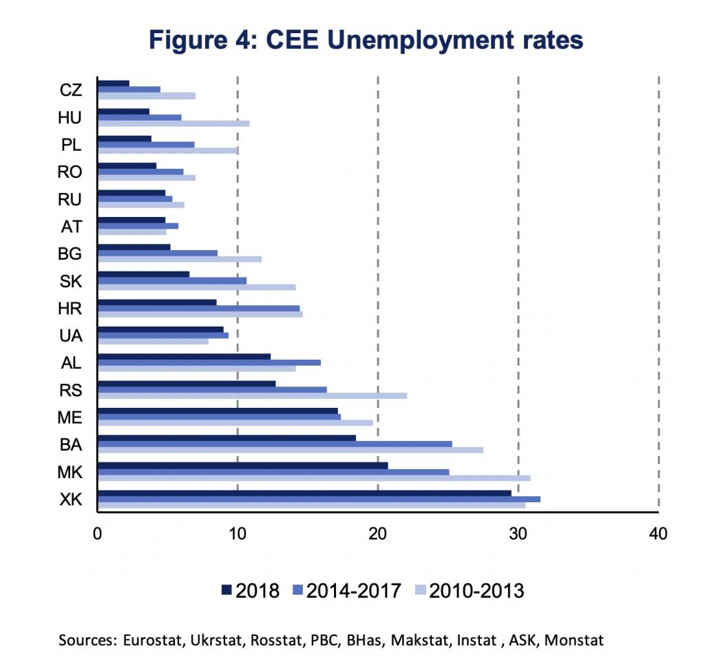 Improvements in CEE labor markets have substantially contributed to the region’s resilience. In 2018, unemployment rates have been substantially lower than in previous periods, with the exception of Ukraine where the unemployment rate increased until 2017. Yet, labor markets continue to be heterogeneous. Unemployment rates range from 2.2 % in the Czech Republic to almost 29.5 % in Kosovo. They tend to be lower in European Union member states and higher at the Western Balkan (Figure 4).