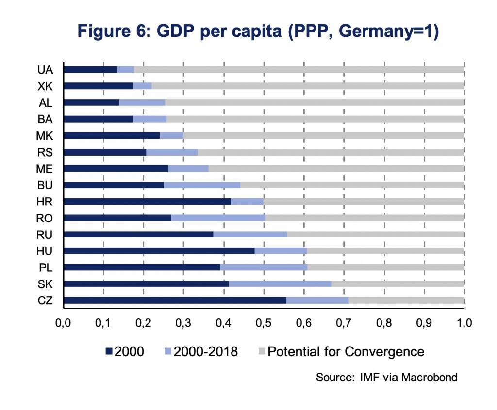 The strong business cycle has ensured economic convergence to continue. CEE economies, particularly those which have already been part of the EU, have fueled European convergence prior to the Great Recession of 2008/09. After the crisis, convergence has continued, yet, at a slower pace. Since 2000 the average EU-CEE economy has close the GDP per capita gap to Germany by 20 %-age points. Poland, for instance, had a GDP per capita of 39 % the German level in 2000, compared to 61 % in 2018 (Figure 6). Countries at the Western Balkan were less successful. Ukraine has closed the gap to Germany by 4 %, even though starting at a much lower level (13 %) than Poland. This shows that there is no guarantee for convergence. Convergence is conditional on, so called, social capacities which are vital for technological progress to diffuse. The quality of national institutions as well as a labor force equipped with the necessary skills are among the best validated examples.