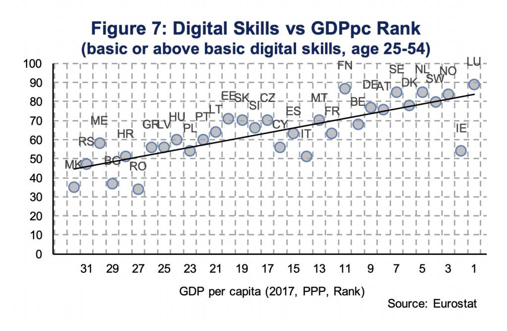 Looking ahead, the innovative capacity with respect to digital technologies and processes will be vital to converge. Comparing digital skills of the labor force (age 25-54) with a country’s rank of GDP per capita, gives a descriptive indication with respect to the potential of convergence based on digital technologies (Figure 7). The positive correlation shows that richer countries tend to have a labor force which is better equipped with digital skills. However, some countries, like Central European economies (Czech Republic, Hungary and Slovakia) have a well digitally skilled labor force relative to the level of income. Other economies, like Italy and Ireland, but also Romania and Bulgaria, have an ill-equipped labor force relative to their level of income. Hence, in order to reap the full benefits of digital technologies and to be able to adapt technologies from the frontier, the latter countries will have to increase the digital skills of the work force.
