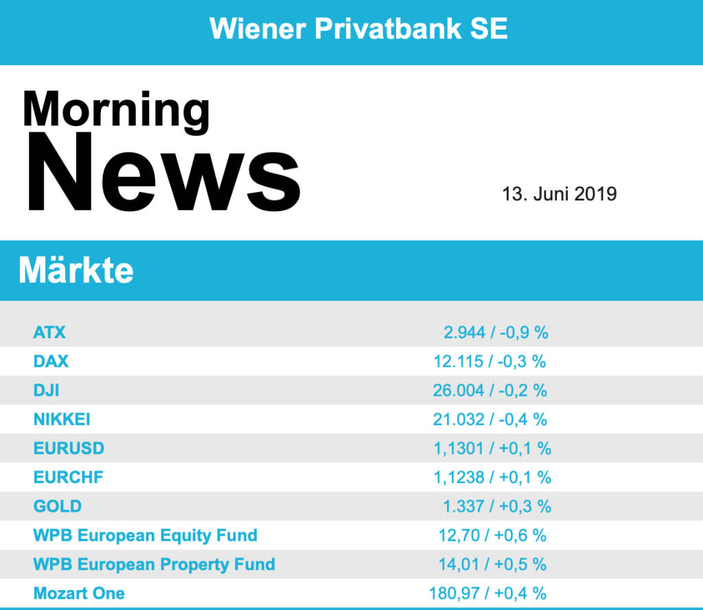 In den USA geriet gestern der Technologiesektor stärker unter Druck als die Standardwerte, der Nasdaq 100 schloss mit einem Abschlag von 0,6%, während es für Dow Jones und S&P 500 ein Minus von 0,2% zu verzeichnen gab. Die anhaltenden Drohungen von US-Präsident Donald Trump im Handelsstreit mit China erweisen sich nach wie vor als Hemmschuh. Anleger gewichten die Handelssorgen und die damit verbundene wirtschaftliche Unsicherheit derzeit höher als mögliche Zinssenkungen. Die amerikanischen Verbraucherpreise für den Mai waren deutlicher zurückgegangen als erwartet. Die aktuell etwas schwächere Inflation wäre damit kein Hemmschuh für die Notenbank Fed, falls die ihre Geldpolitik lockern wollte.