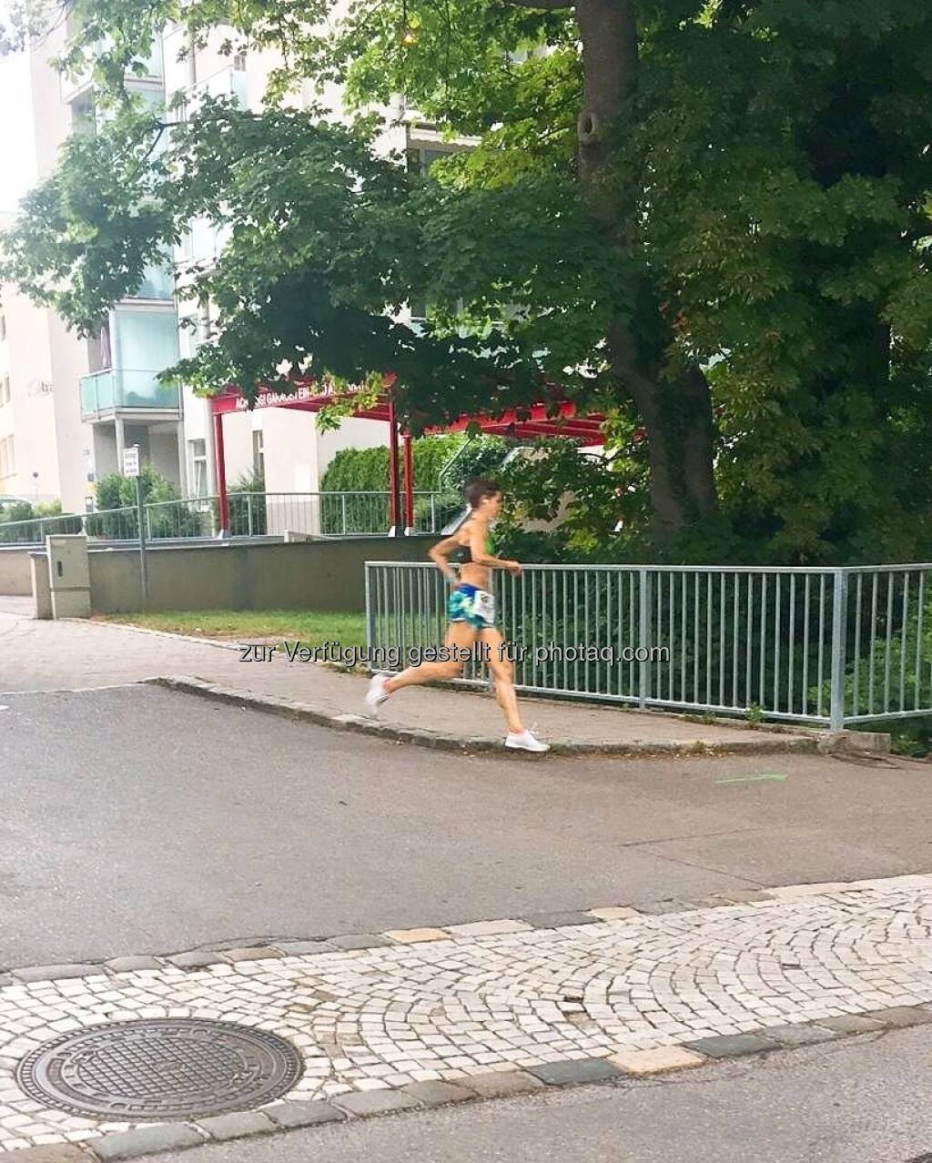 Bei der Kreuzung am Foto muss man rechts abbiegen, sonst läuft man auf der Strecke des Badener Stadtlaufs weiter. In der ersten Runde habe ich immer wieder nachgefragt, ob ich da überhaupt noch richtig bin, aber es konnte mir keineR der Streckenposten beantworten. Als ich dann schon über 3km auf der Uhr hatte war klar, dass das nicht stimmen konnte. Nach ein wenig Herumfragerei wurde ich dann über eine Seitenstraße wieder auf die Hauptstrecke des Stadtlaufs zurückgeschickt... Runde 1 war somit mit 5,1km und jede Menge Ärger in 20:03 geschafft. Ich wollte eigentlich abbrechen, da es klar war, dass der Sieg außer Reichweite liegt. Nur hätte ich mich dann noch mehr geärgert. Also bin ich die 2. Runde mit viel Wut im Bauch in 13:39 gelaufen.
