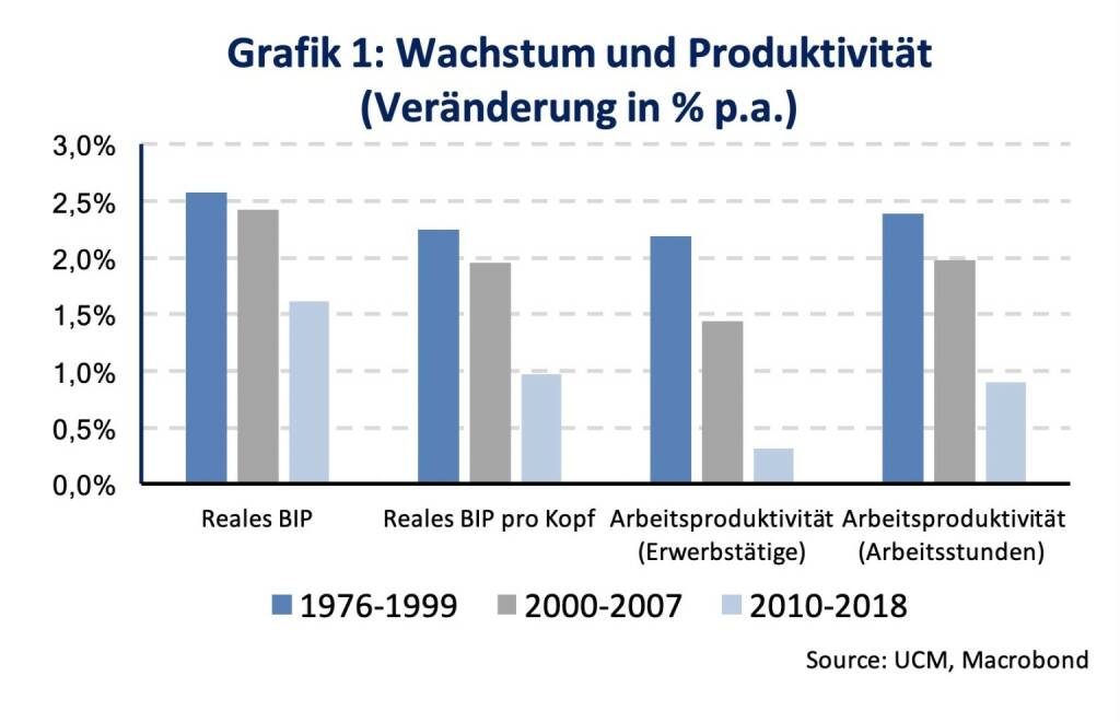 Bereits in der Periode vor der Finanzkrise zeigt sich ein Rückgang des BIP-Wachstums und pro-Kopf BIP-Wachstums von 2,6 % auf 2,4 % bzw. von 2,2 % auf 1,9 %. Wie man sieht lässt sich ein Teil dieses Rückgangs durch geringere durchschnittliche Anstiege der Arbeitsproduktivität (reales BIP pro Erwerbstätigen bzw. pro Arbeitsstunde) erklären.