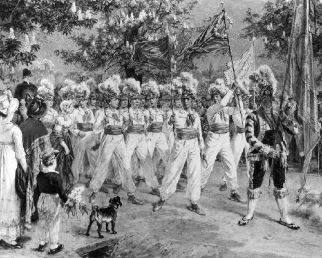 Das Wiener Lauferfest im 19. Jahrhundert auf einem Gemälde von A. Schön: Die Teilnehmer ziehen nach dem Rennen in Festkleidung unter Musikbegleitung in ein Prater-Kaffeehaus. An der Spitze hält der Vorstand die Innungsfahne mit der Aufschrift „Fortschritt“ hoch. Dahinter folgen die Sieger des Rennens mit ihren Ehrenfahnen „Der Adler“, „Der Hirsch“ und „Das Pferd“.