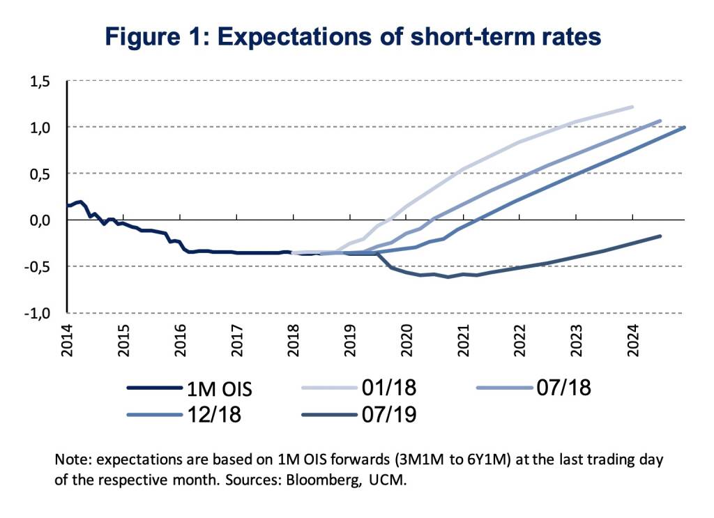 Among the many changes to the ECB’s communication was an adjustment to the forward guidance on policy rates. The Government Council added an easing bias opening the way for lowering interest rates in September. The ECB now expects “interest rates to remain at their present or lower levels at least through the first half of 2020”. The date dependency has already been altered twice after having been introduced in June 2018, when the Governing Council expected interest rates to remain at their present levels “at least through the summer of 2019”. In March 2019 the date dependency was then shifted to the end of the year and has further been postponed to the first half of 2020 in June. Financial market expectations of the path of short-term ECB interest rates have responded accordingly by postponing the date of a possible rate hike. Figure 1 shows expected future short-term rates as of January 2018, July 2018, December 2018 and July 2019 based on 1-month overnight index swap (OIS) forwards. Most recently financial markets expect ECB interest rates to remain at or below their present levels until 2024. In early 2018, it was believed that a similar level of interest rates will already be reached by mid-2019.