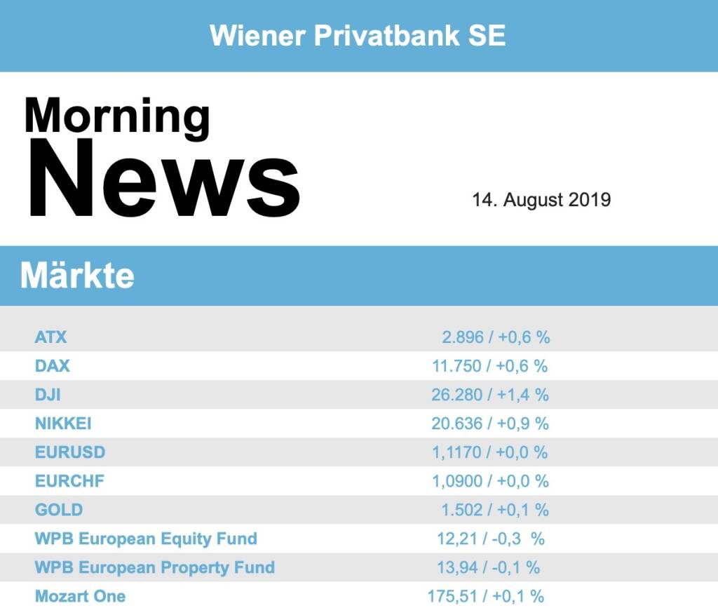 Vorbörslich sind die Märkte heute Mittwoch zur Eröffnung in Europa in etwa auf Vortagesniveau uns somit behauptet indiziert. Die asiatischen Börsen verbuchten größtenteils Gewinne. DO & CO (im Laufe des Tages) sowie Semperit präsentieren heute Ihre Geschäftszahlen. (siehe unten). Makroökonomisch stehen heute in Europa Arbeitslosenzahlen (FRA), Verbraucherpreise (FRA,UK) das BIP Q2/19 (DEU/EU) sowie die Industrieproduktion in der EU im Fokus der Märkte. In den USA erwarten wir Daten zu den Im- und Exportpreisen sowie den wöchentlichen Ölbericht des Energieministeriums.