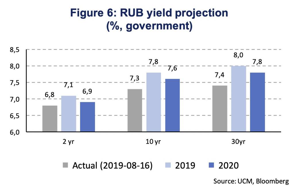 The inflation rate declined to 4.6 % in July after a temporary increase above 5 % earlier in the year. The price declines are broad-based across categories with food & beverage (5.5 %), non-food (3.6 %) and services prices (3.3 %) exhibiting lower price increases than in early 2019. Especially, the food & beverage component had contributed to price increases in 2019 likely related to the VAT increase (from 18 to 20 %). Survey inflation expectations indicate no significant tendencies that agents expect higher inflation. Against the background of weak economic activity (the CBR projects 1-1.5 % % GDP growth for 2019 in the June Monetary Policy Report) and lowering inflation, the Central Bank of Russia (CBR) cut the key interest rate in June and July by 25 basis points each time to 7.25 % and even indicated the possibility of further key rate reduction in one of the upcoming meetings. The CBR also expects that inflation will return to its 4 % target and that monetary policy will become neutral during 2020.