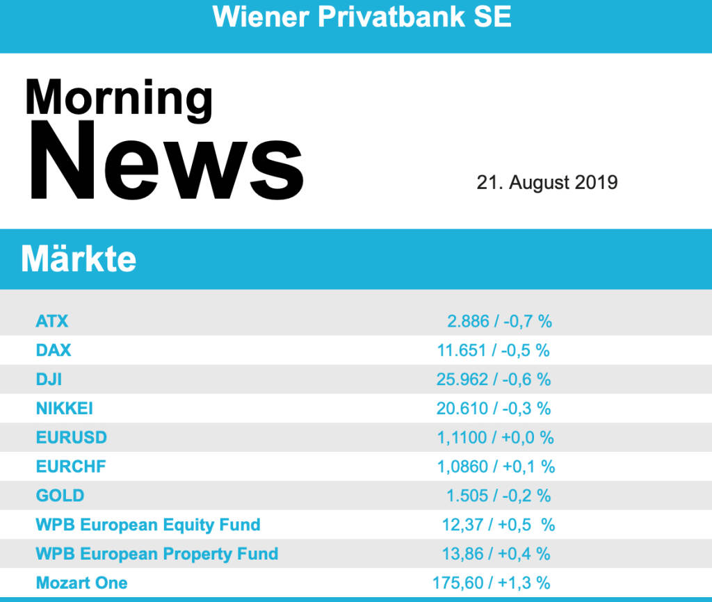 Vorbörslich sind die Märkte heute Mittwoch in Europa unverändert zum Vortag indiziert. Die asiatischen Börsen tendieren ebenso nahezu gleichbleibend. Makroökonomisch stehen heute in den USA die Wiederverkäufe Häuser 07/19, der Ölbericht des Energieministeriums und das FOMC Sitzungsprotokoll vom 31.7.19 im Fokus der Märkte. Unternehmensseitig erwarten wir heute Geschäftszahlen von CA-Immo (nachbörslich).