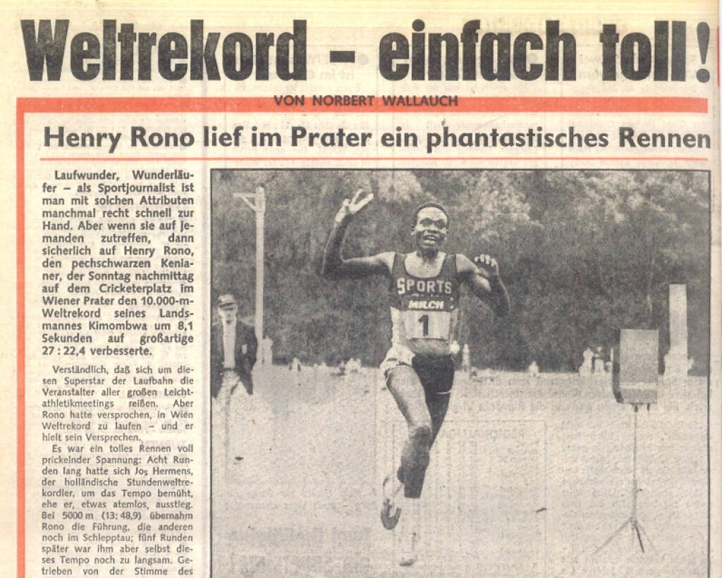 Am 11. Juni 1978 vermeldete die Nachrichtenagentur Agence France Press um 16.20 Uhr über Fernschreiben in aller Welt mit einer Eilmeldung einen neuen Weltrekord im 10.000-m-Lauf. Dieses AFP-„Bulletin“ war mit dem Hinweis auf „athletisme“ und gleich vier Klingelzeichen versehen. Eine Art Alarm, womit in den Redaktionen auf eine Sensation aufmerksam gemacht wurde. Die es wahrhaft war. Der Nachrichten-Flash, den ich in den Bergen von Rono-Unterlagen in meinem Archiv gut hüte, lautete: „Der Kenianer Henry Rono hat Sonntag in Wien über 10.000 m in 27:22,47 einen neuen Weltrekord aufgestellt. Den alten Rekord hielt seit dem 30. Juni 1977 sein Landsmann Samson Kimobwa in 27:30,47.“