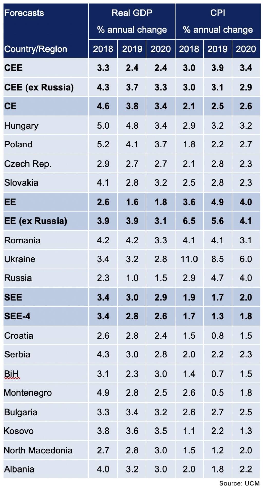 Central- and Eastern Europe (CEE) continues to outpace Euro Area growth. Economic convergence continues. The manufacturing slump in Germany and prolonged uncertainty with weak business sentiment start to spill over to the small and open economies of the CEE region. It is unlikely that the region can fully decouple from the Euro Area business cycle, yet substantial improvements in labor markets have made CEE more resilient. We expect the region (ex Russia) to grow at 3.7 % in 2019 and 3.3. % in 2020 (Table 1).