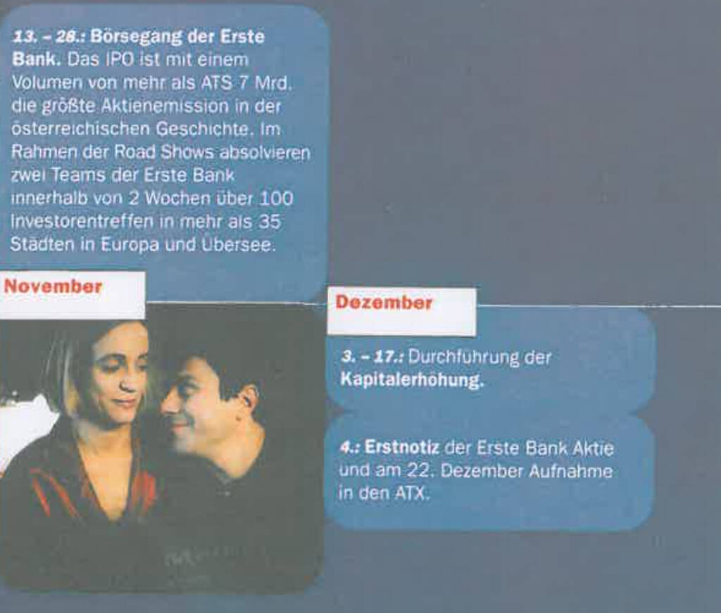 Heute ist jedenfalls ein besonderer Tag. Denn heute vor 22 Jahren, am 4.12.1997, erfolgte die "Erstnotiz" der Erste Bank Aktie, die dann bereits zu Dezember-Verfall in den ATX aufgenommen wurde, kontinuierlich aufstieg und nun seit Jahren der absolute Umsatzking ist.