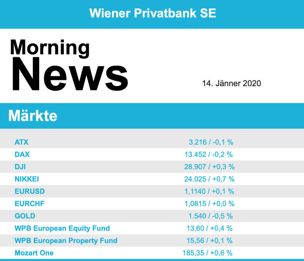 In eine neue Runde bei der Rekordjagd hat sich gestern die Wall Street begeben, viele wichtige Indices schafften neue Höchststände, lediglich der Dow Jones konnte da nicht ganz mithalten und blieb unter den Bestmarken der Vorwoche, ging allerdings mit einem Plus von 0,3% aus dem Handel. Die anderen Indices wurden von der Zuversicht mit Hinblick der auf diese Woche anstehenden Unterzeichnung des ersten Teilabkommens im Handelsstreit zwischen den USA und China getrieben, vor allem die konjunktursensiblen Technologieaktien profitierten, und so schloss der Nasdaq 100 1,2% stärker, der marktbreite S&P 500 konnte sich um 0,7% verbessern. Besonders stark präsentierte sich gestern Tesla mit einem Zuwachs von 9,8%, der Elektroautohersteller wurde von Aussagen eines chinesischen Regierungsvertreters, wonach nicht geplant sei, die Subventionen für die Branche in diesem Jahr so stark zu senken wie noch 2019, angetrieben. Zusätzlich äußerte sich Oppenheimer positiv zu der Aktie und erhöhte das Kursziel weiter. Auch andere Technologiewerte wie Apple , Alphabet und Facebook konnten sich zu neuen Höchstständen aufschwingen. Positiv bemerkbar machte sich wieder einmal der Fleischersatz-Spezialist Beyond Meat , der mit einem Plus von 19,0% erstmals seit Oktober wieder die Marke von 100 US-Dollar überschreiten konnte. Laut einer Studie eines Analystenhauses könnte der Markt für diese Produkte von einer Größe von 19 Milliarden Dollar im Jahr 2018 bis auf 100 Milliarden Dollar gegen Jahresende ansteigen.