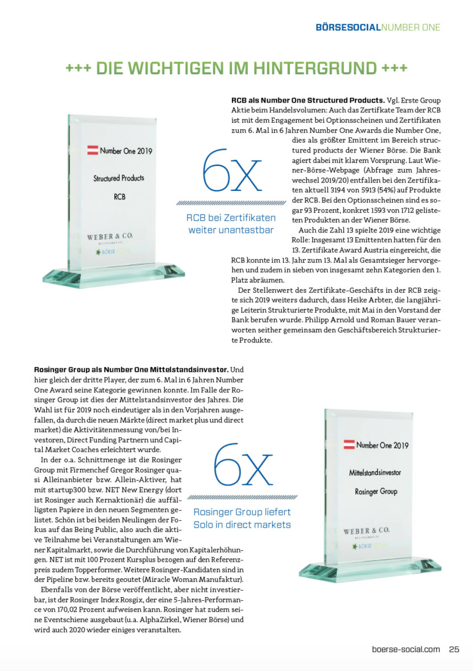Ebenfalls von der Börse veröffentlicht, aber nicht investierbar, ist der Rosinger Index Rosgix, der eine 5-Jahres-Performance von 170,02 Prozent aufweisen kann. Rosinger hat zudem seine Eventschiene ausgebaut (u.a. AlphaZirkel, Wiener Börse) und wird auch 2020 wieder einiges veranstalten.