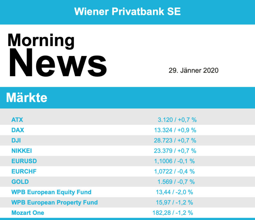 Ebenfalls Boden gut machen konnten die Märkte in den USA, der Dow Jones schloss mit einem Plus von 0,7%, der marktbreite S&P 500 stieg um 1,0% und der technologielastige Nasdaq 100 verbesserte sich um 1,6%. Frische US-Konjunkturdaten hatten positiven Einfluss auf die Notierungen. In den USA stiegen die Aufträge für langlebige Wirtschaftsgüter Ende 2019 unerwartet deutlich. Zudem hellte sich die Stimmung der US-Verbraucher im Januar unerwartet deutlich auf. Ferner legten die Preise am US-Immobilienmarkt im November stärker als erwartet zu und verzeichneten den größten Zuwachs seit neun Monaten. Aus Unternehmenssicht stand erneut die Quartalsberichtssaison im Anlegerfokus. So verbuchte der Pharmariese Pfizer aufgrund wachsender Konkurrenz durch Nachahmermedikamente 2019 einen Umsatzrückgang und rechnet damit auch im laufenden Jahr, die Aktien fielen um 5,0%, da die Erwartungen an den Gewinn pro Aktie ebenfalls nicht erfüllt wurden. Ebenfalls enttäuschend waren die Ergebnisse des Mischkonzernes 3M , der Gewinn blieb deutlich hinter den Erwartungen zurück, dass das Unternehmen mit einem neuen Geschäftsmodell und schlankeren Strukturen das Wachstum ankurbeln und effizienter werden will konnte die Anleger nicht überzeugen und der Titel musste 5,7% abgeben. Gute Geschäfte mit der Luftfahrtindustrie verliehen United Technologies im vierten Quartal einen Schub nach oben, auch wenn die Aussichten unter anderem auf Grund der Probleme bei Boeing nicht rosig sind konnte sich der Titel um 1,2% verbessern. Delphi Techologies, das ja von BorgWarner übernommen werden soll, konnte auf Grund dieser Nachricht einen Kursspring von 59,8% verzeichnen. Harley Davidson leidet nach wie vor unter dem Handelsstreit zwischen den USA und China und enttäuschte mit dem Gewinn, der Motorradhersteller musste 3,0% billiger aus dem Handel gehen.