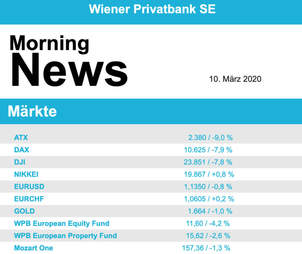 Das, was sich gestern an den Börsen in Europa abgespielt hat, lässt sich am besten mit dem Wort Panik beschreiben. Nachdem Italien über das Wochenende ein Viertel des Landes abgeriegelt und unter Quarantäne gestellt hatte, setzte Verkaufswelle ein, die den EuroStoxx 50 um 8,5% einbrechen liess und auf das niedrigste Niveau seit Jänner 2019 brachte. Zusätzlich erlebte der Ölpreis den stärksten Einbruch seit fast 30 Jahren, nachdem Verhandlungen führender Ölstaaten über eine Drosselung der Fördermenge gescheitert waren. Auch die Börse in Paris musste 8,4% abgeben, in Deutschland fiel der Dax um 7,9% und in London endete der Handel mit einem Minus von 7,7% für den FTSE 100. Am deutlichsten war der Rückgang in Italien, die Mailänder Börse rutschte gleich um 11,2% ab.
