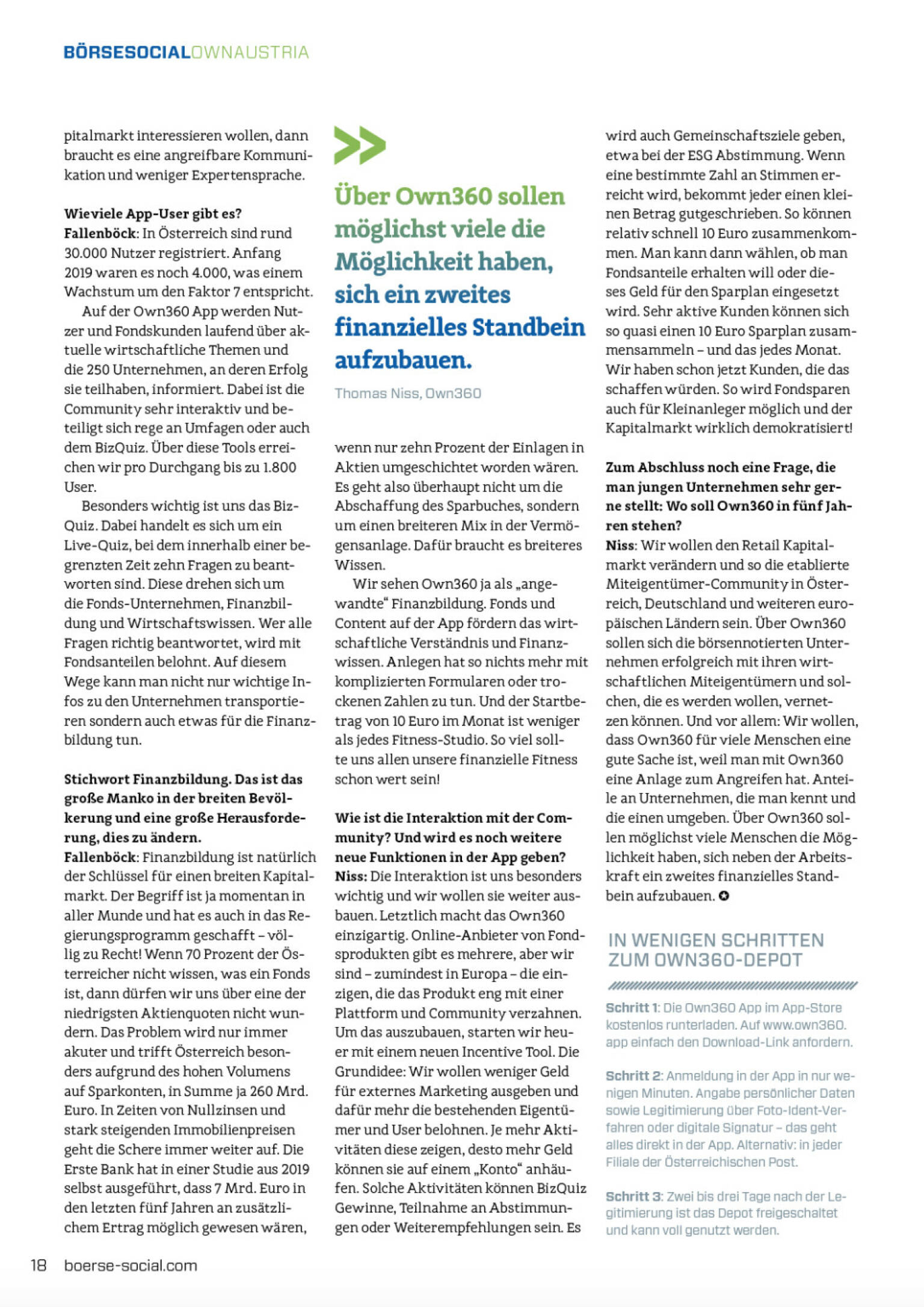 Fallenböck: Wir sind mit vielen der Fondsunternehmen in engem Kontakt, vor allem mit den Unternehmen an der Wiener Börse bzw. mit großer österreichischer Niederlassung. Wir sind auch auf vielen Hauptversammlungen in Österreich und Deutschland präsent. Erst kürzlich waren wir etwa bei Infineon oder EVN. Unsere Community ist ja gerade für die Investor Relations Abteilungen sehr interessant, weil man über Own360 eine sehr stattliche Zahl an Retail-Aktionären, bzw. solche die es werden wollen, erreichen kann. Wir nennen diese Positionierung auch Equity Branding, weil es darum geht, nicht nur Finanzzahlen sondern die Geschichte dahinter zu erzählen. Gerade dieses Story-Telling können wir über die App und unsere Social Media Präsenzen sehr gut abbilden. Es soll anschaulich zeigen, worauf der Börsenkurs und seine Entwicklung fußen. Welche Transformation ist gerade im Gange? Welche innovativen Produkte bringen das Geschäft nach vorne? Was tut ein Unternehmen im Klimaschutz und wie wirkt sich das auf die Kennzahlen aus? Gerade wenn wir breitere Bevölkerungsgruppen für den Kapitalmarkt interessieren wollen, dann braucht es eine angreifbare Kommunikation und weniger Expertensprache.