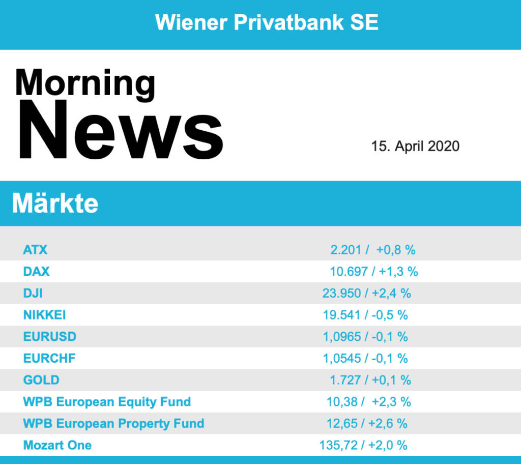 In den USA wurde das Geschehen einmal mehr von den Technologiewerten dominiert, der Nasdaq 100 konnte sich um stolze 4,3% verbessern, im Vergleich dazu fielen die Zuwächse der anderen Indices etwas ab, der Dow Jones erzielte ein Plus von 2,4% und der S&P 500 konnte um 3,1% vorrücken. Auch in den USA sorgten die weniger stark als befürchtet zurückgegangenen Exportdaten aus China für Optimismus, auch wenn der Internationale Währungsfonds in seiner neuesten Studie mit einer weltweiten Schrumpfung der Wirtschaftsleistung von rund drei Prozent rechnet. Im Blickpunkt standen die ersten Ergebnisse der Berichtssaison, Johnson & Johnson konnte ein beeindruckendes erstes Quartal vorlegen, auch wenn für den weiteren Jahresverlauf ein Umsatz- und Gewinnrückgang erwartet wird, soll die Dividende dennoch erhöht werden und zusätzlich wird der Konzern seine Anstrengungen auf die Entwicklung einer Covid-19-Impfung legen, die Aktie erzielte ein Plus von 4,5%. Noch besser war im Dow Jones Walgreens Boots Alliance mit einem Zuwachs von 5,2%, auch Apple konnte sich um 5,1% verbessern auf Grund einer Meldung, wonach sich die iPhone-Absatzmengen in China im März stark erholt haben. JPMorgan musste auf Grund der Corona-Krise einen deutlichen Gewinneinbruch vermelden, die Aktie gab 2,7% ab. Noch deutlicher rutschte der Rivale Wells Fargo nach unten, die Bank hat deutlich weniger Gewinn gemacht und musste auf Grund der aktuellen Situation große Rückstellungen bilden, das führte zu einem Minus von 4,0%. Amazon kristallisiert sich als einer der Gewinner der Krise heraus, weil immer mehr Kunden auf Online-Bestellungen ausweichen müssen, gestern konnte der Titel um 5,3% auf ein neues Rekordhoch zulegen. Auch Tesla war erneut stark, dank eines positiven Kommentars von Credit Suisse konnte der Elektroautohersteller einen weiteren Zuwachs von 9,1% erzielen.