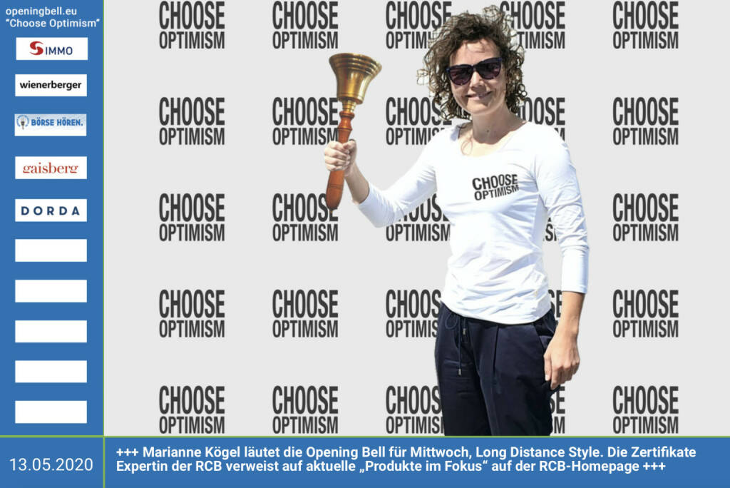 13.5.: Marianne Kögel läutet die Opening Bell für Mittwoch, Long Distance Style (vorher/nachher unter https://photaq.com//page/index/3781). . Die Zertifikate Expertin der RCB verweist auf aktuelle „Produkte im Fokus“ auf der RCB-Homepage https://www.rcb.at/produkteimfokus / mehr Infos unter http://www.openingbell.eu mehr Choose Optimism: https://boerse-social.com/category/choose_optimism https://www.facebook.com/chooseoptimism/