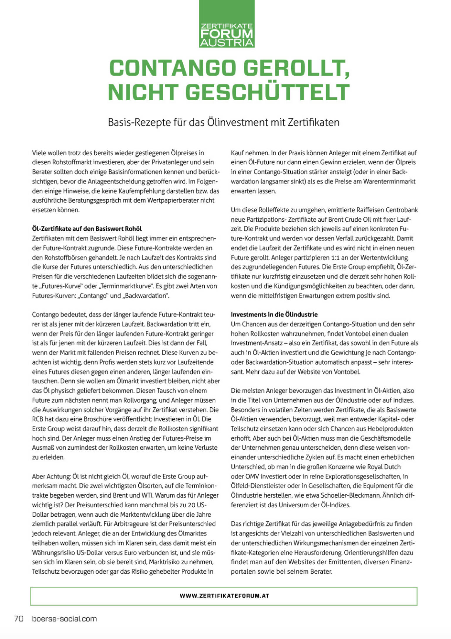 Contango bedeutet, dass der länger laufende Future-Kontrakt teurer ist als jener mit der kürzeren Laufzeit. Backwardation tritt ein, wenn der Preis für den länger laufenden Future-Kontrakt geringer ist als für jenen mit der kürzeren Laufzeit. Dies ist dann der Fall, wenn der Markt mit fallenden Preisen rechnet. Diese Kurven zu beachten ist wichtig, denn Profis werden stets kurz vor Laufzeitende eines Futures diesen gegen einen anderen, länger laufenden eintauschen. Denn sie wollen am Ölmarkt investiert bleiben, nicht aber das Öl physisch geliefert bekommen. Diesen Tausch von einem Future zum nächsten nennt man Rollvorgang, und Anleger müssen die Auswirkungen solcher Vorgänge auf ihr Zertifikat verstehen. Die RCB hat dazu eine Broschüre veröffentlicht: Investieren in Öl. Die Erste Group weist darauf hin, dass derzeit die Rollkosten signifikant hoch sind. Der Anleger muss einen Anstieg der Futures-Preise im Ausmaß von zumindest der Rollkosten erwarten, um keine Verluste zu erleiden.