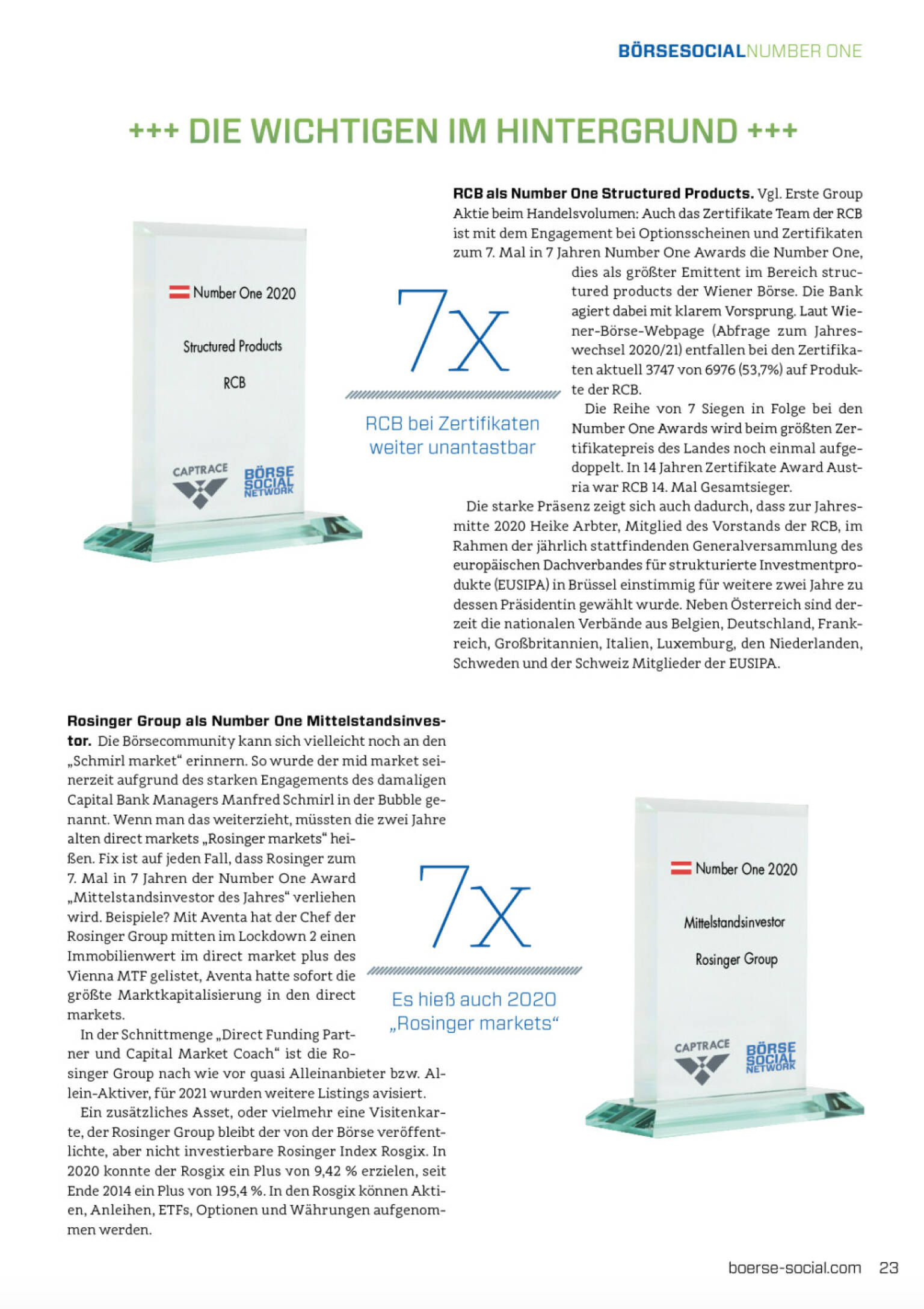 1320 ZeichenDie Börsecommunity kann sich vielleicht noch an den „Schmirl market“ erinnern. So wurde der mid market seinerzeit aufgrund des starken Engagements des damaligen Capital Bank Managers Manfred Schmirl in der Bubble genannt. Wenn man das weiterzieht, müssten die zwei Jahre alten direct markets „Rosinger markets“ heißen. Fix ist auf jeden Fall, dass Rosinger zum 7. Mal in 7 Jahren der Number One Award „Mittelstandsinvestor des Jahres“ verliehen wird. Beispiele? Mit Aventa hat der Chef der Rosinger Group mitten im Lockdown 2 einen Immobilienwert im direct market plus des Vienna MTF gelistet, Aventa hatte sofort die größte Marktkapitalisierung in den direct markets.