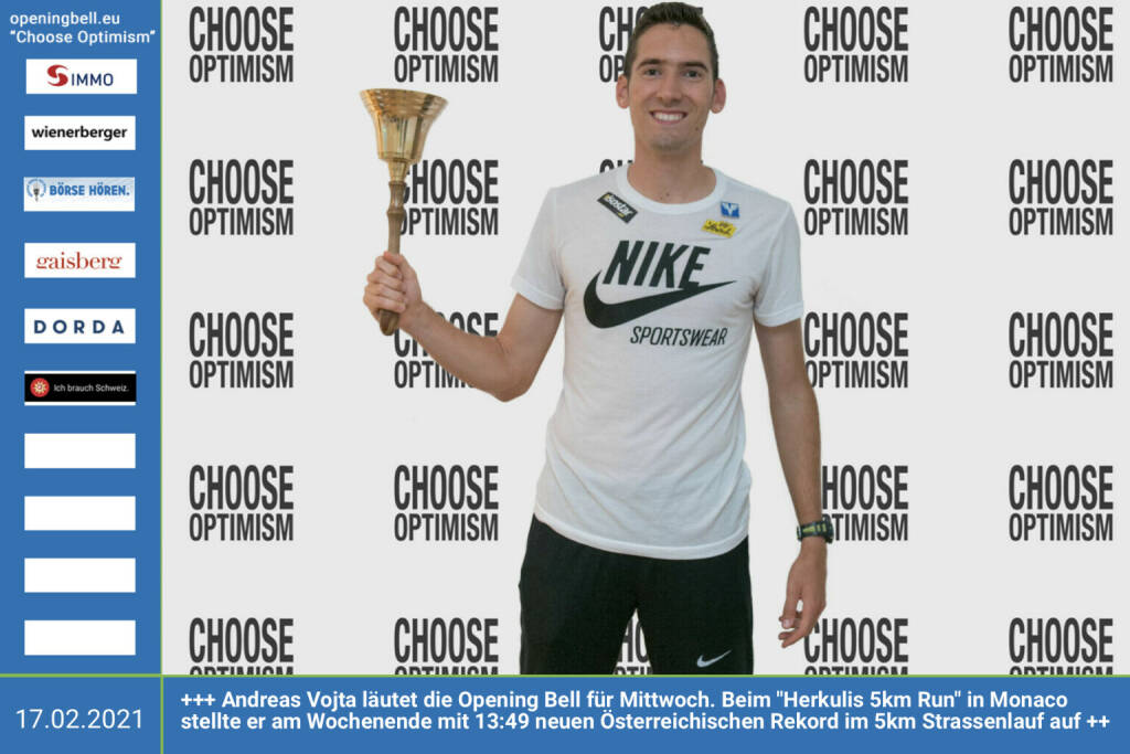 17.2.: Andreas Vojta läutet die Opening Bell für Mittwoch. Beim "Herkulis 5km Run" in Monaco stellte er am Wochenende mit 13:49 neuen Österreichischen Rekord im 5km Strassenlauf auf, siehe https://www.youtube.com/watch?v=BwcQ5bM5Oiw http://www.sportgeschichte.at - mehr Choose Optimism: https://boerse-social.com/category/choose_optimism https://www.facebook.com/chooseoptimism