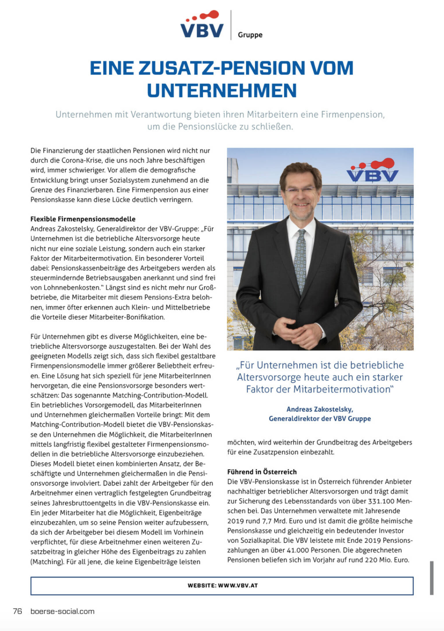 Andreas Zakostelsky, Generaldirektor der VBV-Gruppe: „Für Unternehmen ist die betriebliche Altersvorsorge heute nicht nur eine soziale Leistung, sondern auch ein starker Faktor der Mitarbeitermotivation. Ein besonderer Vorteil dabei: Pensionskassenbeiträge des Arbeitgebers werden als steuermindernde Betriebsausgaben anerkannt und sind frei von Lohnnebenkosten.“ Längst sind es nicht mehr nur Großbetriebe, die Mitarbeiter mit diesem Pensions-Extra belohnen, immer öfter erkennen auch Klein- und Mittelbetriebe die Vorteile dieser Mitarbeiter-Bonifikation.