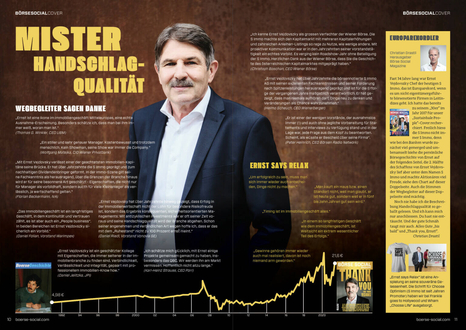 Fast 34 Jahre lang war Ernst Vejdovszky Chef der heutigen S Immo, das ist Europarekord, wenn es um nicht eigentümergeführte börsenotierte Firmen in Leitindizes geht. Ich hatte das bereits zu seinem „30er“ im Jahr 2017 für unser „Sustainbale People“-Cover recherchiert. Freilich hiess die S Immo nicht immer S Immo, denn wie bei den Banken wurde zunächst viel gemerged und umbenamselt (siehe die persönliche Börsegeschichte von Ernst auf der folgenden Seite), die 2. Hälfte des Schaffens von Ernst Vejdovszky lief aber unter dem Namen S Immo und machte Aktionären viel Freude, siehe den Chart auf dieser Doppelseite. Auch die Stimmen der Wegbegleiter auf dieser Doppelseite sind mächtig.