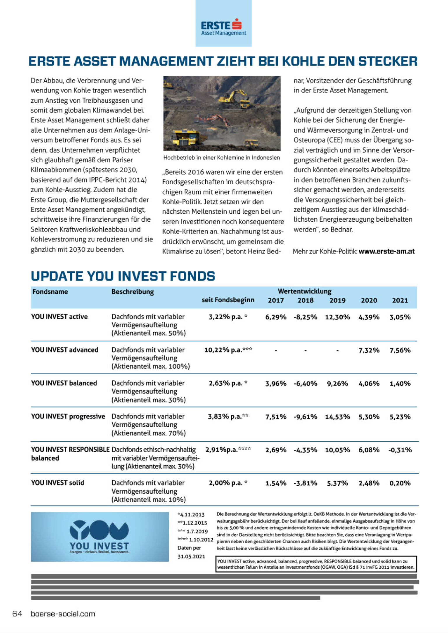 1623 ZeichenDer Abbau, die Verbrennung und Verwendung von Kohle tragen wesentlich zum Anstieg von Treibhausgasen und somit dem globalen Klimawandel bei. Erste Asset Management schließt daher alle Unternehmen aus dem Anlage-Universum betroffener Fonds aus. Es sei denn, das Unternehmen verpflichtet sich glaubhaft gemäß dem Pariser Klimaabkommen (spätestens 2030, basierend auf dem IPPC-Bericht 2014) zum Kohle-Ausstieg. Zudem hat die Erste Group, die Muttergesellschaft der Erste Asset Management angekündigt, schrittweise ihre Finanzierungen für die Sektoren Kraftwerkskohleabbau und Kohleverstromung zu reduzieren und sie gänzlich mit 2030 zu beenden.