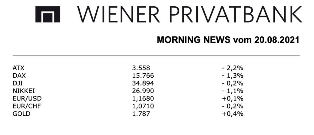 Für den heimischen Markt ging es gestern deutlich nach unten, der ATX verzeichnete ein Minus von 2,2%, das sogar noch etwas größer ausfiel als bei den großen europäischen Börsen. Im Blickpunkt standen gestern eine Reihe von Unternehmensergebnissen, Semperit konnte sich nach der Zahlenvorlage um 2,2% verbessern, der Umsatz des Gummi- und Kautschukkonzerns legte heuer im ersten Halbjahr gegenüber der Vergleichsperiode 2020 um 57,7 Prozent auf 660,8 Millionen Euro zu, unterm Strich blieb ein Gewinn von 173,9 Millionen Euro, das waren um 71 Prozent mehr als vor einem Jahr. Uniqa verbesserte sich nach den Zahlen um 0,8%, der Versicherungskonzern hat im ersten Halbjahr die Ergebnisse stark gesteigert. Mayr-Melnhof hingegen musste 2,1% nachgeben, der Kartonhersteller hat im Vorjahr rund ein Viertel weniger Gewinn gemacht. Schoeller-Bleckmann schwächte sich nach der Ergebnispräsentation ebenfalls deutlich ab und musste 4,3% tiefer schliessen, woran aber auch die europaweite Schwäche des Sektors mitbeteiligt war, der Ölfeldausrüster hat sich im ersten Halbjahr 2021 weiter erholt. Der Umsatz steigt zwar seit mehreren Quartalen kontinuierlich, liegt aber noch deutlich unter dem Vorkrisenniveau, immerhin ist das Unternehmen wieder in die Gewinnzone zurückgekehrt. Auch der zweite Vertreter aus diesem Sektor, OMV, musste gestern ein klares Minus von 3,5% hinnehmen. Die Flughafen-Wien-Gruppe befindet sich wegen der Coronapandemie weiterhin tief in der Verlustzone, unterm Strich stieg der Verlust im ersten Halbjahr im Vergleich zum Vorjahreszeitraum von 18,2 auf 32,5 Millionen Euro, der Umsatz verringerte sich von 195,8 auf 128,6 Millionen Euro, die Aktie rutschte gestern um 1,7% nach unten. Die Erste Group hat das Kursziel für die Addiko Bank von 14,2 Euro auf 14,7 Euro erhöht und die „Hold“-Einstufung bestätigt, der Titel endete unverändert. Die Berenberg Bank erhöhte das Kursziel für FACC von 8,5 Euro auf 8,9 Euro und bestätigte die Empfehlung „Hold“, der Luftfahrtzulieferer musste 2,9% nachgeben. Die Raiffeisen strich die Kaufempfehlung für die Österreichische Post und bewertet den Titel jetzt als „Hold“, das Kursziel wurde von 38,0 Euro auf 43,0 Euro angehoben, die Aktie musste mit einem Rückgang von 1,0% aus dem Handel gehen.