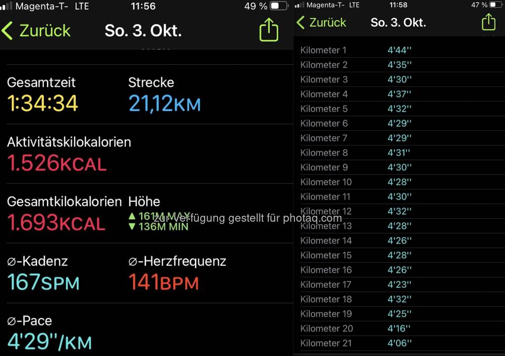 So happy wie heute war ich schon ewig nicht mehr nach einem Lauf. Es macht halt einen grossen Unterschied, ob man schnell zwischendurch zwischen der Arbeit läuft (und dauernd wer anruft) oder am Wochenende ausgeruht (und keiner ruft an). Heute habe ich einen Halbmarathon in 1:34,34 bewältigt, das ist Pace 4:29 und da bin ich sehr happy. Vor allem, weil ich deutliches Negativ-Splitting geschafft habe, die ersten Kilometer deutlich langsamer. Und so kam es, dass ich die ersten 12 Kilometer de facto gar nicht gespürt habe. Und dann sind es halt nur noch 9 Kilometer und da darf man sich ruhig ein bissl anstrengen dürfen. Mein Ziel für die nächsten 1 1/2 Jahre ist es, den HM unter 1:30 zu schaffen. Sind doch noch 13 Sek. pro Kilometer und das ist nicht wenig. Ich hab aber einen Plan, wie das geht. Wenn ich gesund bleibe, schaffe ich das.