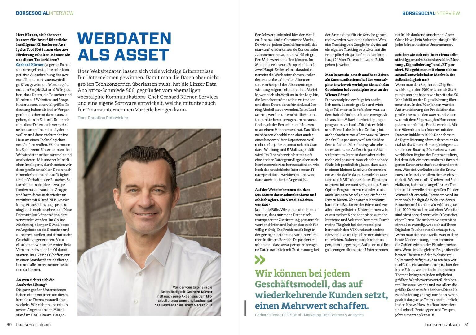 7299 ZeichenÜber Websitedaten lassen sich viele wichtige Erkenntnisse für Unternehmen gewinnen. Damit man die Daten aber nicht großen Techkonzernen überlassen muss, hat die Linzer Data Analytics-Schmiede 506, gegründet vom ehemaligen voestalpine Kommunikations-Chef Gerhard Kürner, Services und eine eigene Software entwickelt, welche mitunter auch für Finanzunternehmen Vorteile bringen kann.