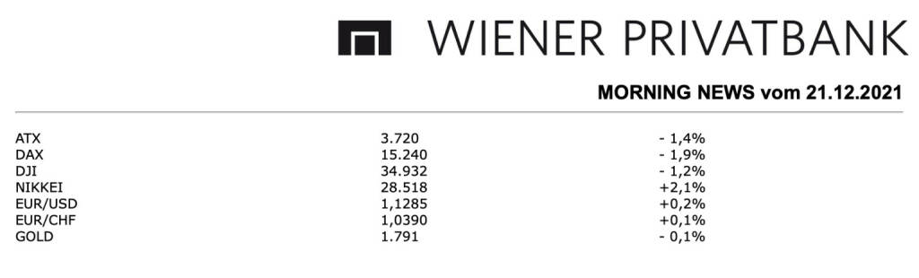 Auch in Wien legten sich die rasch zunehmenden Infektionszahlen mit der Omikron-Variante auf die Stimmung, der ATX musste den Handel mit einem deutlichen Minus von 1,4% beenden. Von der Konjunkturseite kamen mangels neuer Datenveröffentlichungen keine entscheidenden Impulse, und auch die Nachrichtenlage zu den einzelnen Unternehmen war wieder sehr dünn. Die OMV kündigte an, die geplante ReOil Anlage, mit der Kunststoffe in synthetischen Rohstoff für die Petrochemie umgewandelt werden sollen, Anfang übernächsten Jahres in Betrieb zu nehmen, der Ölkonzern musste dennoch 2,4% abgeben. Auch der zweite Vertreter aus diesem Sektor, Schoeller-Bleckmann, hatte einen schwachen Tag und musste einen Rückgang von 1,9% hinnehmen. Verkauft wurden auch die Bankentitel, für die Bawag ging es um 1,1% nach unten, bei der Erste Group stand zum Ende ein Minus von 1,7% zu Buche, die Raiffeisen Bank International verbilligte sich um 1,9%, da konnte sich die kleinere, vor allem in Südosteuropa tätige, Addiko Bank noch vergleichsweise gut halten, hier kam es lediglich zu einem Rückgang von 0,4%.