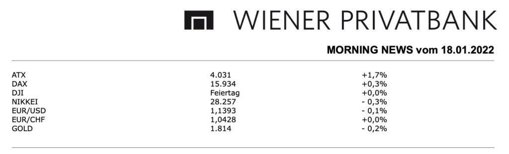 Aus den Morning News der Wiener Privatbank: Deutlich zulegen konnte der heimische Markt zum Wochenauftakt, der ATX konnte den Handel mit einem Plus von 1,7% beenden und war damit klar stärker als die großen europäischen Indices. Auch in Wien war der Handel sehr ruhig, bedingt durch den US-Feiertag und auch durch das Ausbleiben signifikanter makroökonomischer Daten oder Unternehmensnachrichten. Rückenwind kam von relativ robusten asiatischen Börsen, wo eine überraschende Leitzinssenkung in China positive Impulse geliefert hatte, dieser Schritt wurde auch mit zunehmenden wirtschaftlichen Risiken durch die Omikron-Variante des Coronavirus begründet. Sorgen kamen hingegen von geopolitischen Themen wie der Verhärtung der Fronten zwischen Russland und der Ukraine. Bei den Einzelwerten hatten die Banken einen eher guten Tag, die Bawag konnte 2,0% zulegen, für die Erste Group gab es einen Anstieg von 1,9%, die Raiffeisen Bank International konnte sich um 1,6% verbessern, lediglich für die Addiko Bank ging es um 0,4% nach unten. Ebenfalls gut nachgefragt waren die Ölwerte, die OMV schaffte eine Verbesserung von 1,7%, für Schoeller-Bleckmann ging es vor der heute angesetzten Zahlenvorlage gleich um 3,4% nach oben. Einen eher durchwachsenen Tag erlebten die Bauwerte, Porr musste um 1,6% nachgeben, auch Strabag verzeichnete einen Rückgang von 0,9%. Schwächster Titel des gestrigen Tages war Lenzing, der Faserhersteller rutschte um deutliche 4,0% nach unten, auch S Immo wurde verkauft, für den Immobilienkonzern gab es einen Rückgang von 1,8%. An die Spitze der Kursübersicht konnte sich Andritz setzen, für den Anlagenbauer gab es einen stolzen Anstieg von 6,0%. Gut nachgefragt war auch die Vienna Insurance Group, die um 4,1% vorrücken konnte, auch der zweite Vertreter aus diesem Sektor, Uniqa, hatte einen sehr positiven Tag und schaffte eine Verbesserung von 1,9%. Auf den Listen der Einkäufer dick unterstrichen war auch Mayr-Melnhof, für den Kartonhersteller brachte der Handel eine Verbesserung von 4,5%. AT&S konnte sich die wiedergekehrte Stärke der Technologiewerte zunutze machen, der Leiterplattenhersteller ging mit einem Plus von 3,5% aus dem Handel. Ein weiterer Titel mit einem klaren Zuwachs war EVN, der Versorger endete mit einem Plus von 3,3%.